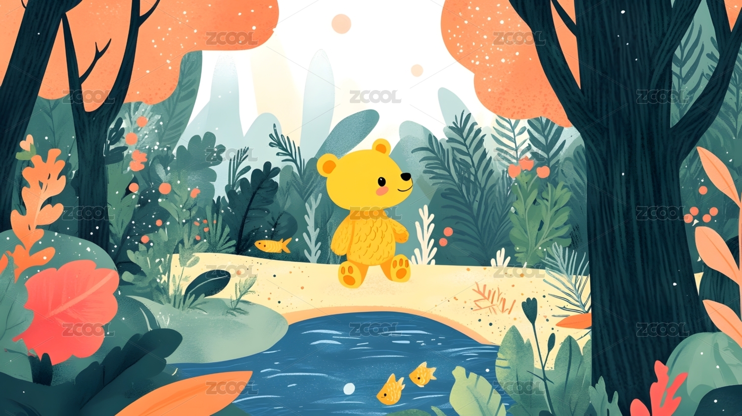 夜里小熊带着兔子和小鸟一起在森林里冒险