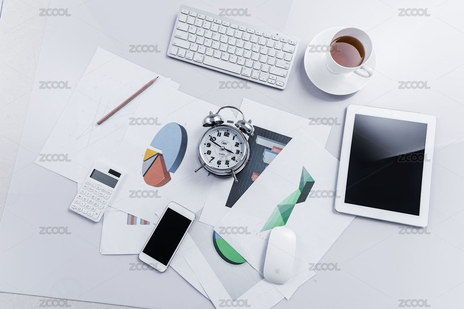 实木桌面上的笔记本电脑计算器手机鼠标彩色铅笔