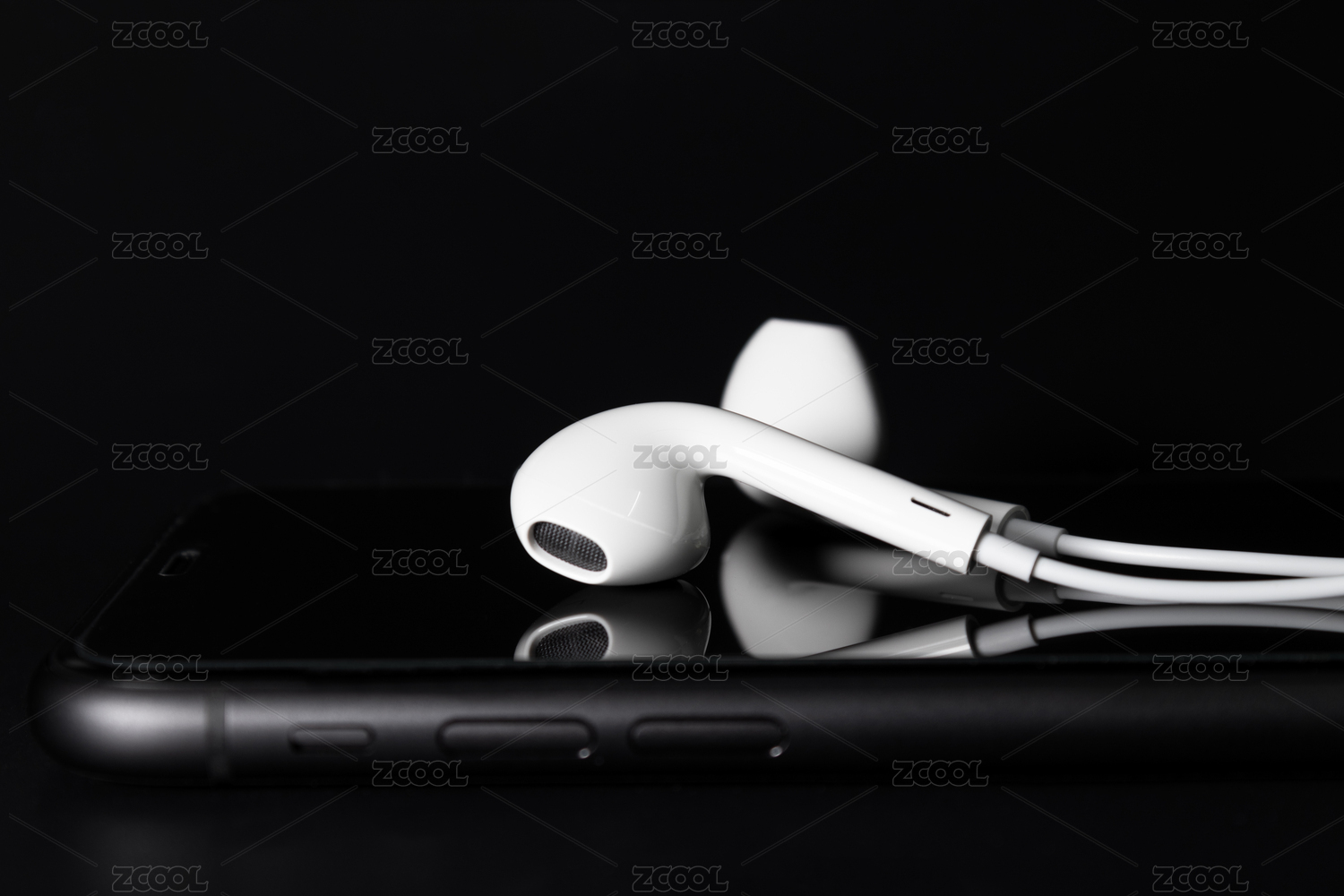 耳机放在手机屏幕上,背景是黑色