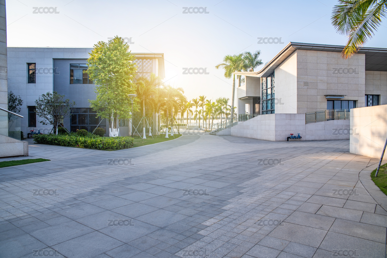 园林里有巨大玻璃幕墙的大现代建筑外部空间