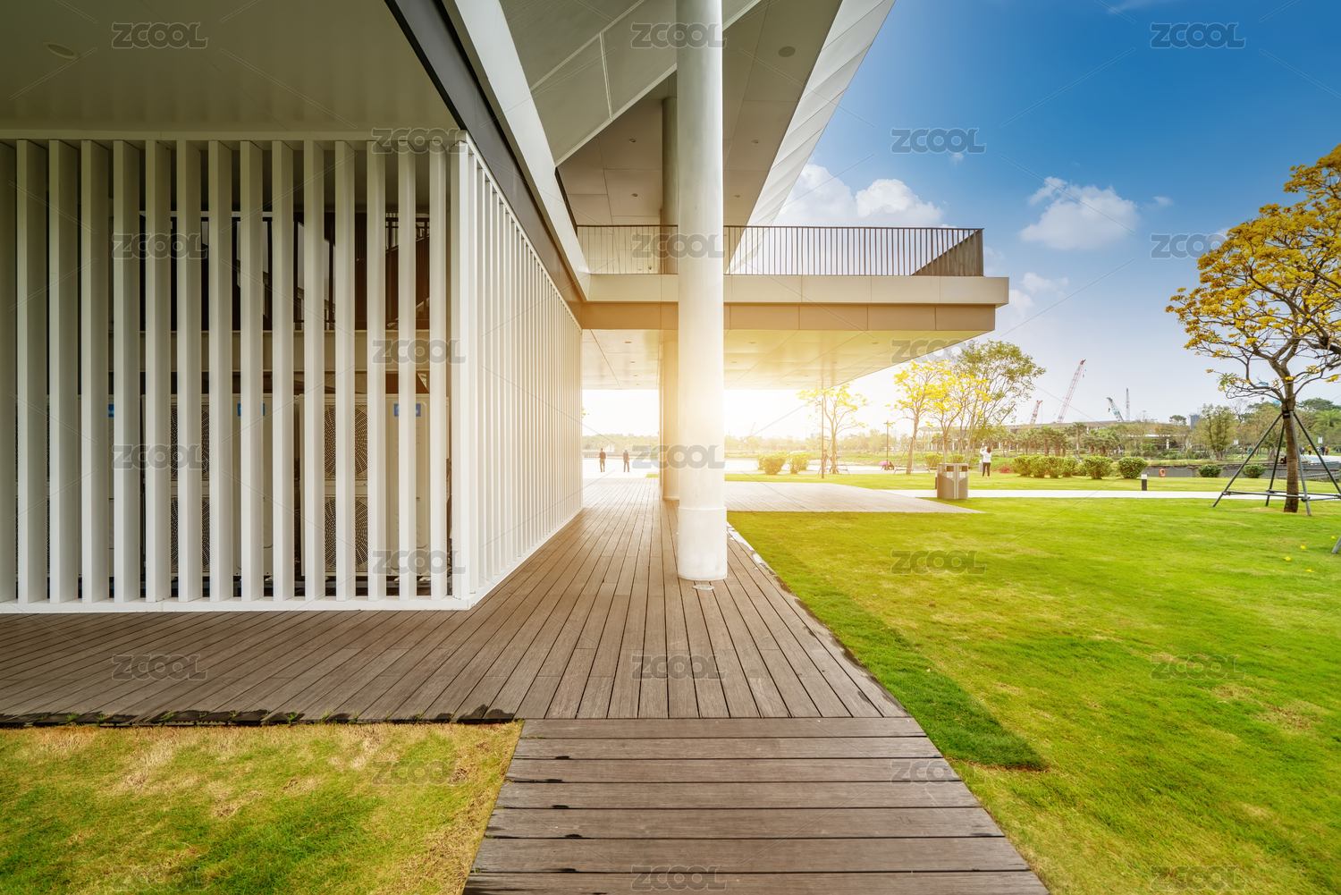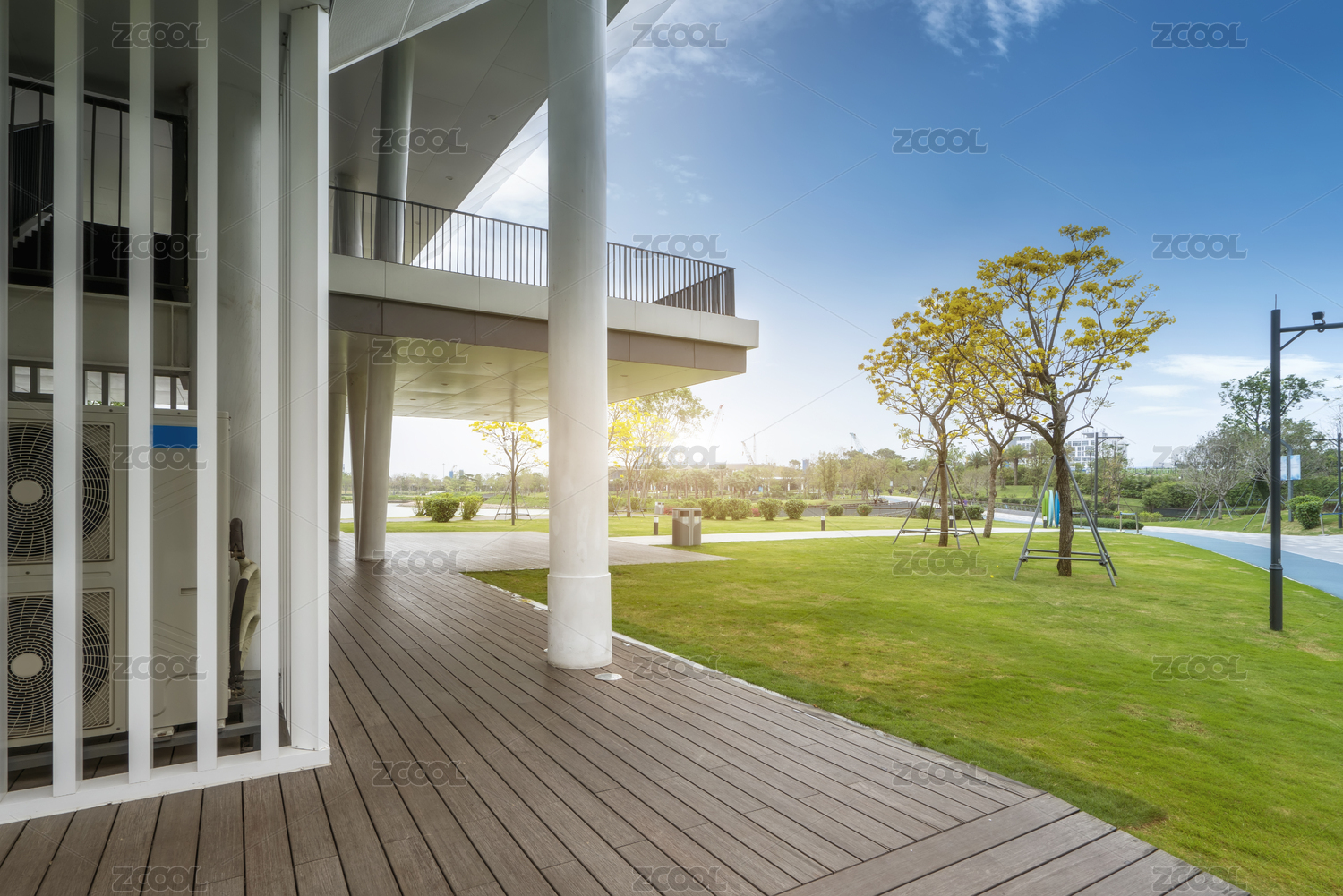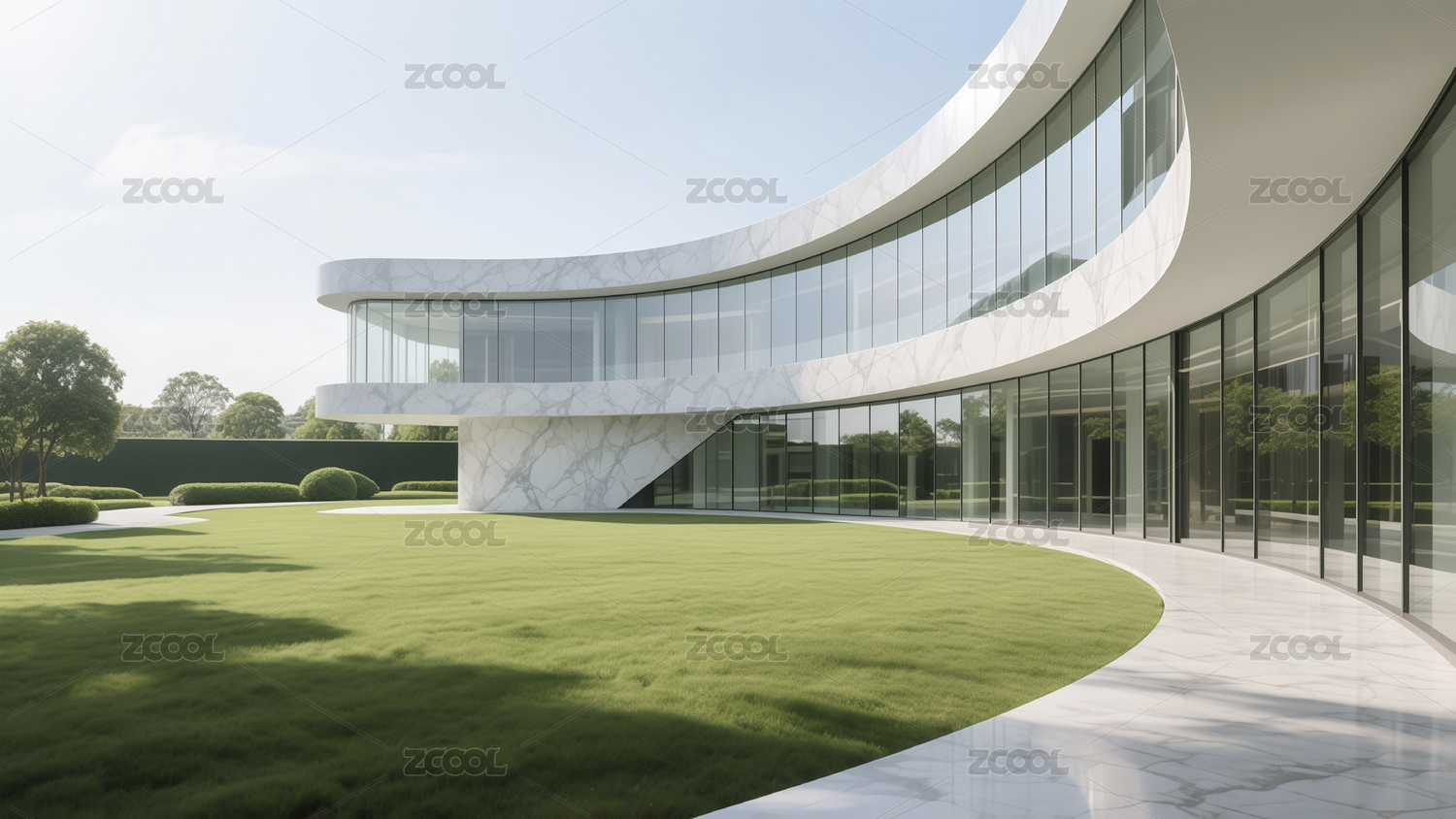 园林里巨大落地窗弯曲造型现代建筑外部空间