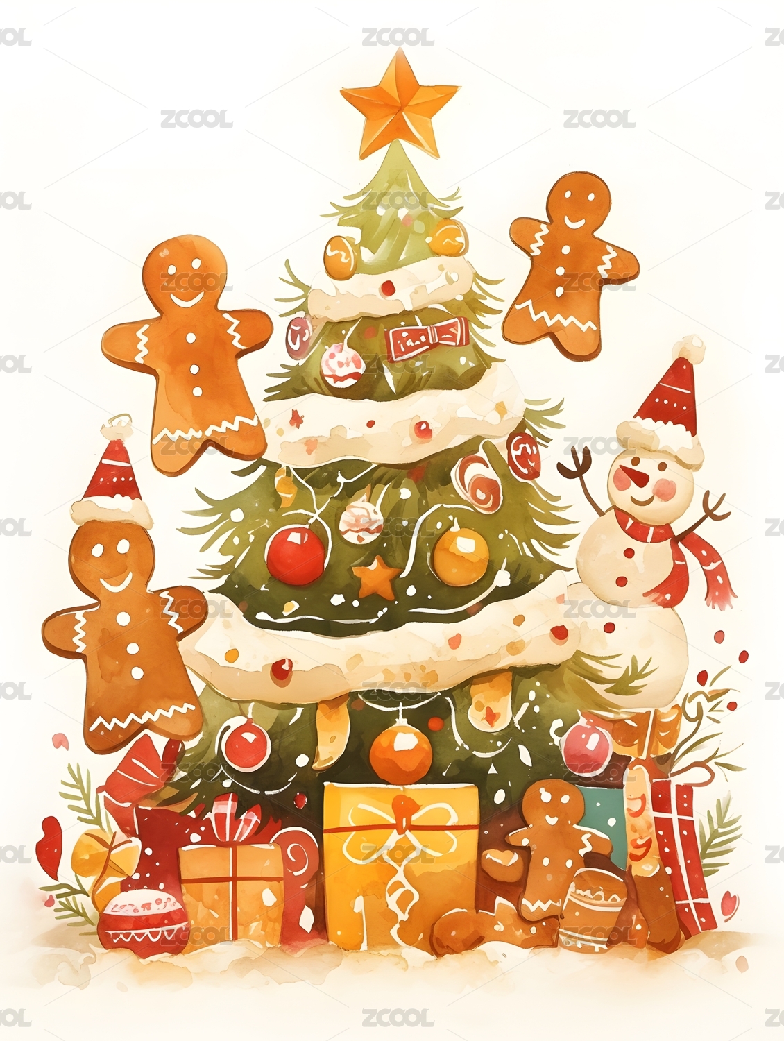 圣诞气氛松树姜饼人礼物盒子T恤图案插画