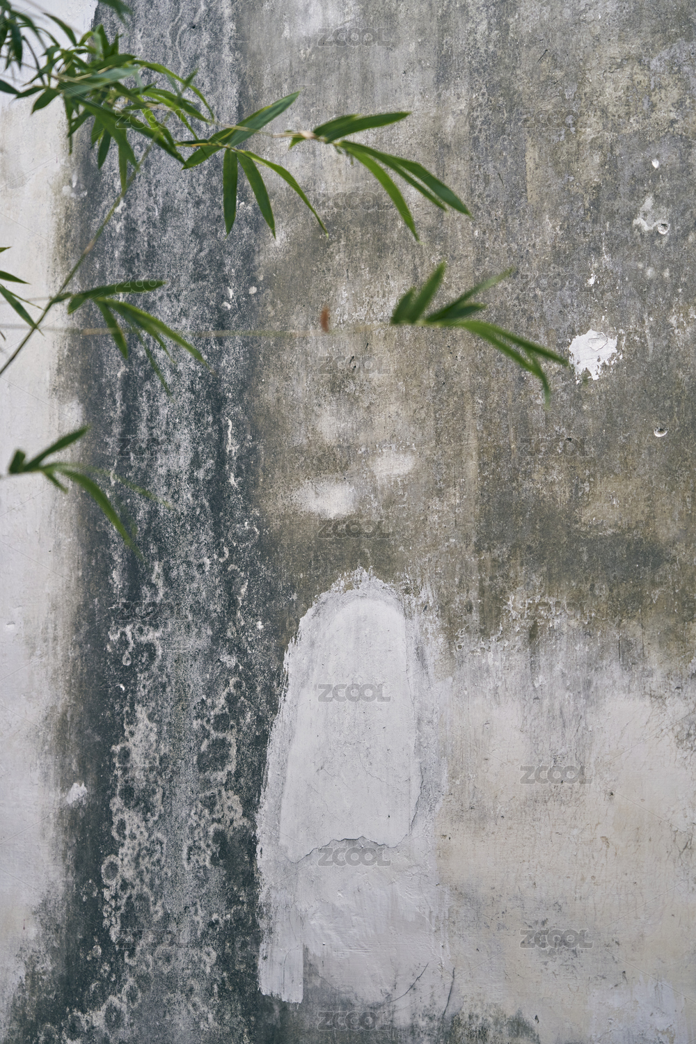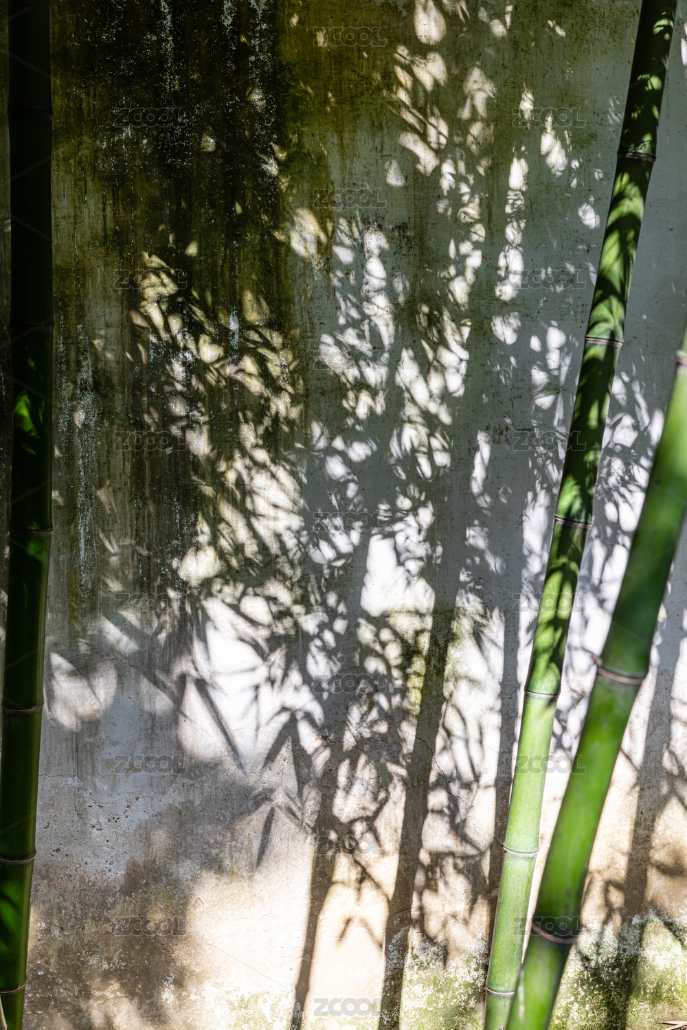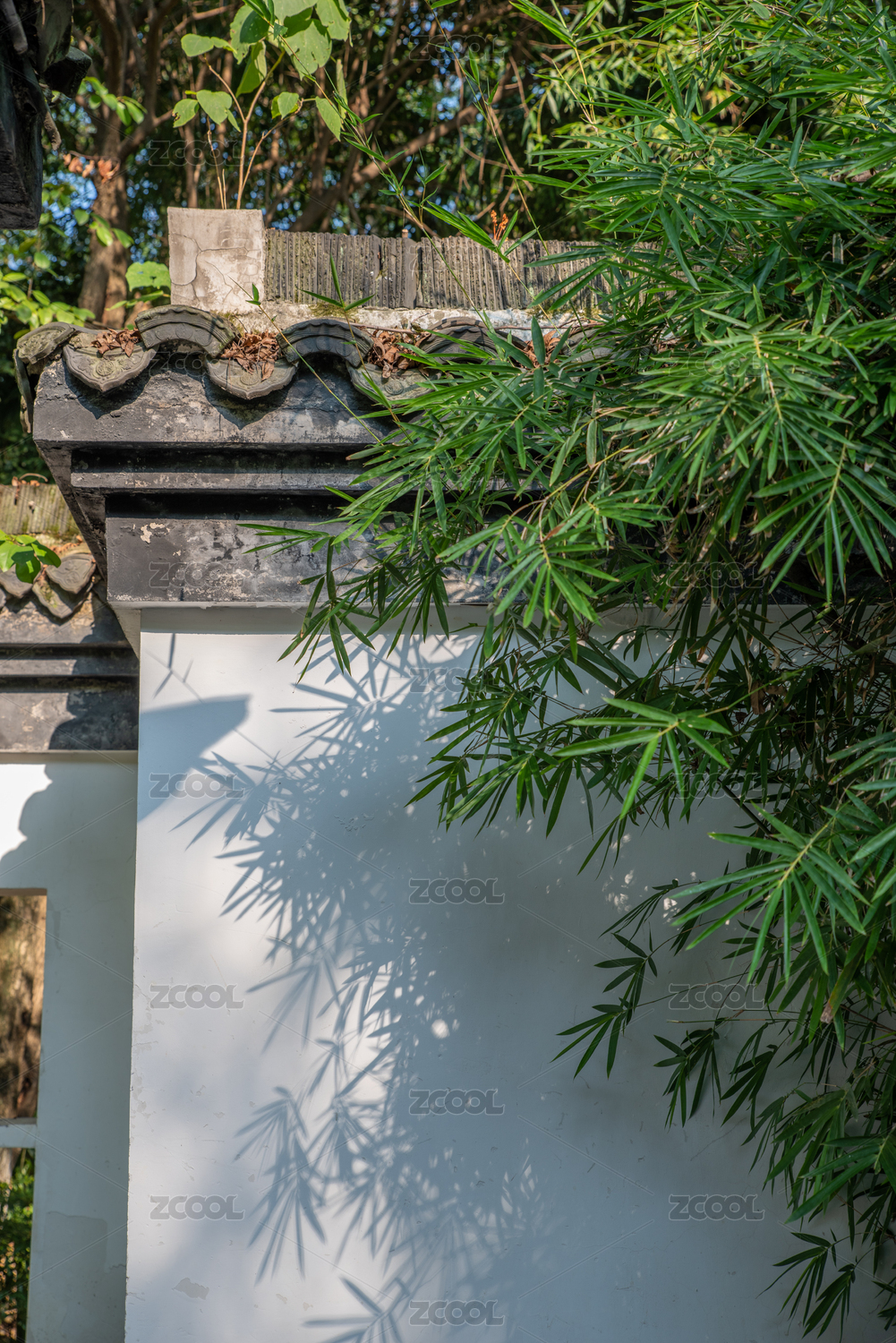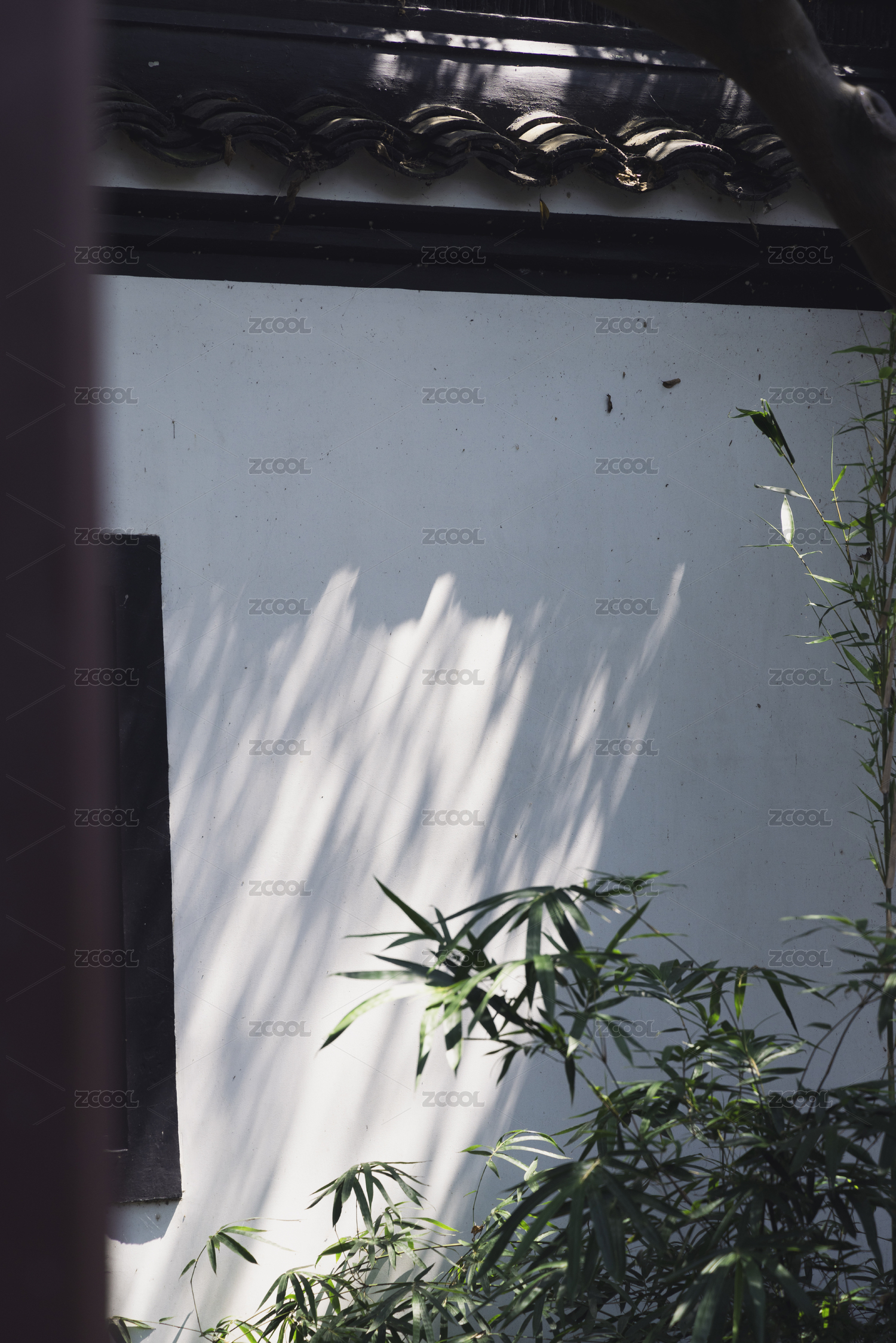 中国江苏苏州园林的一角,翠竹影子打在墙壁上
