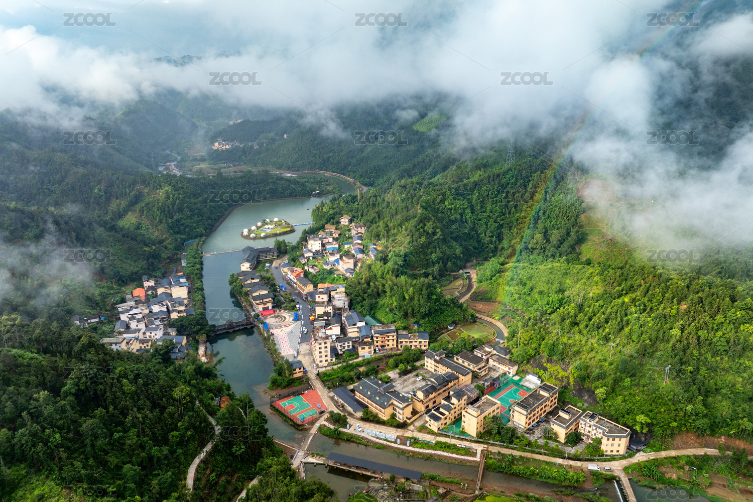 航拍中国浙江台州市黄岩区长潭水库周边村之上山周村