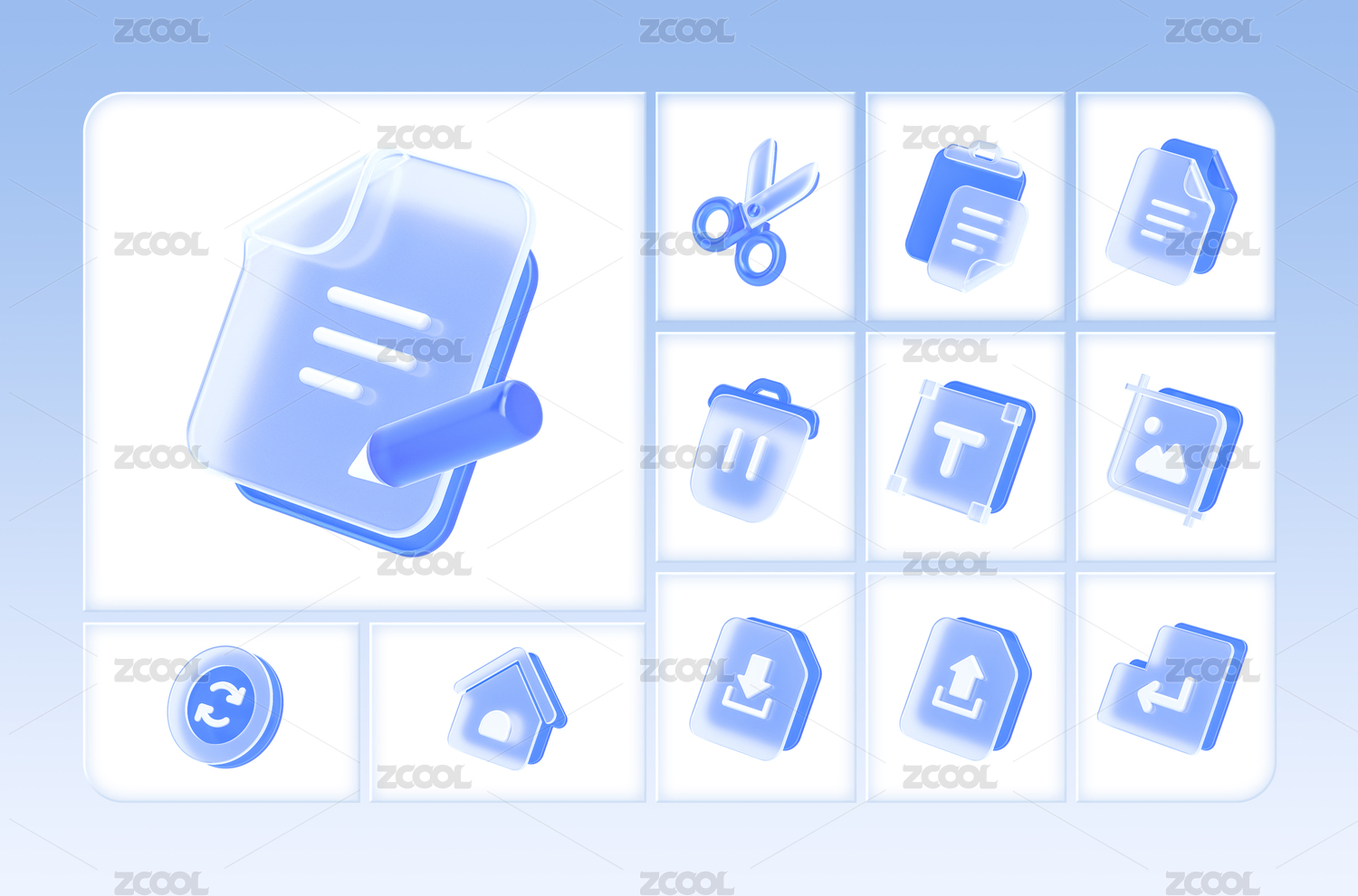蓝白色透明磨砂玻璃图片处理3D图标合集