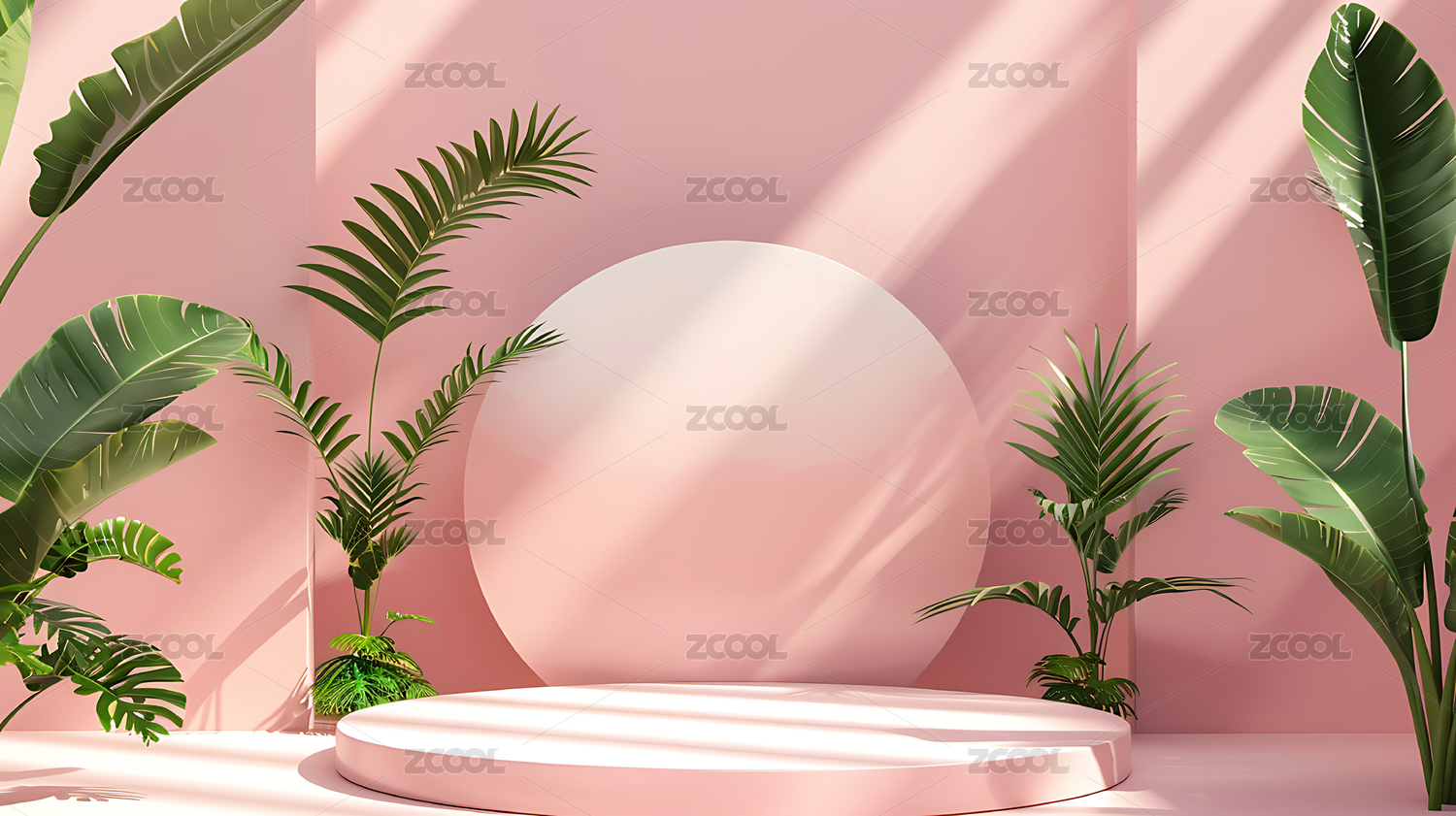 简约场景,讲台,展示台,绿色,热带,植物叶子,矩形,框架,粉色,展台
