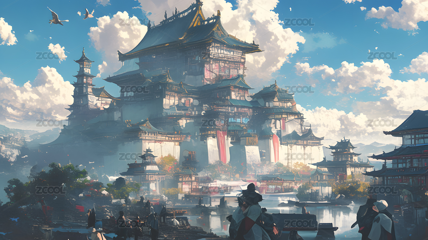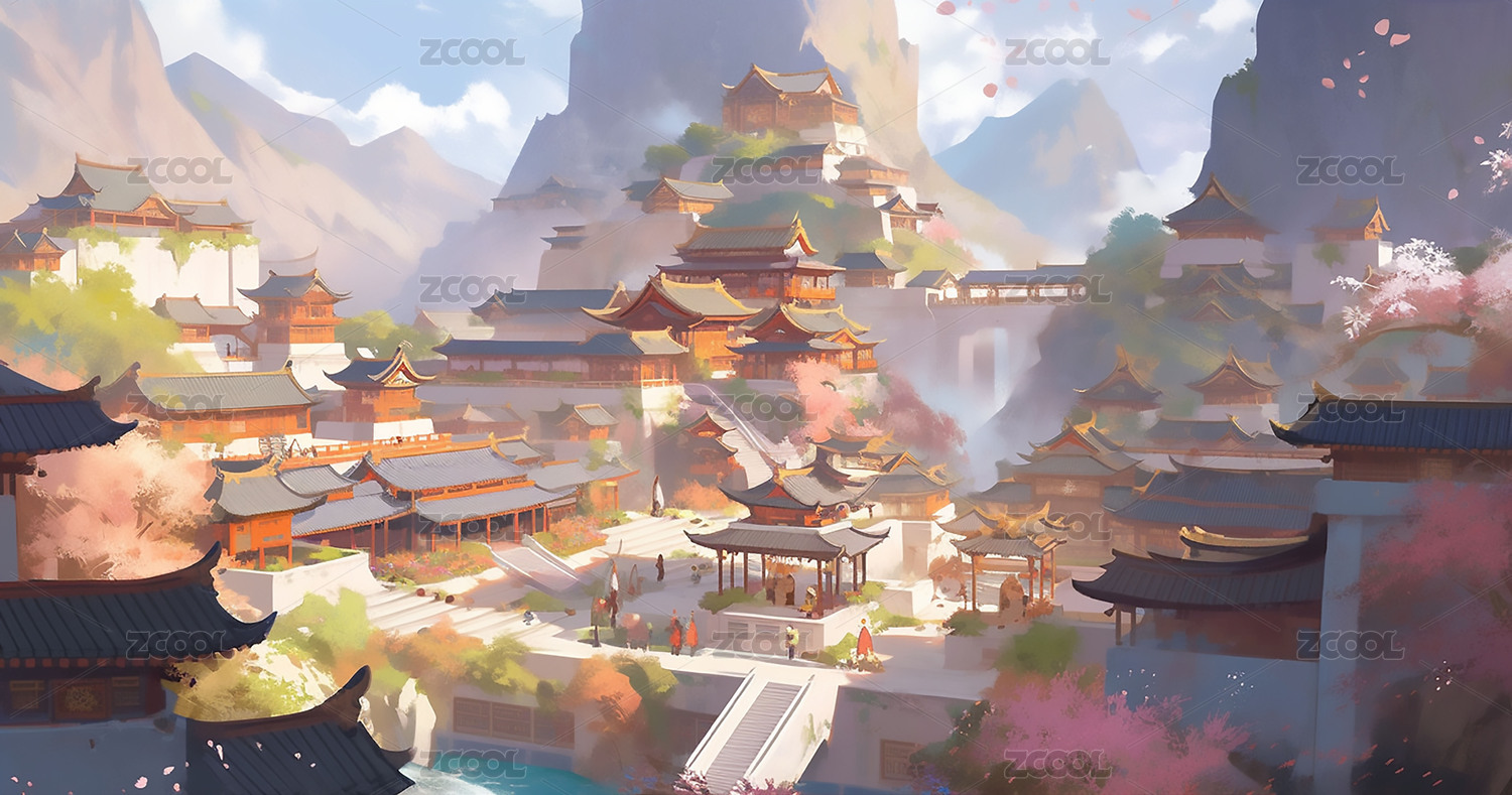 背景,风景,壁纸,风光,手绘,插画,卡通,手绘风,古镇,建筑