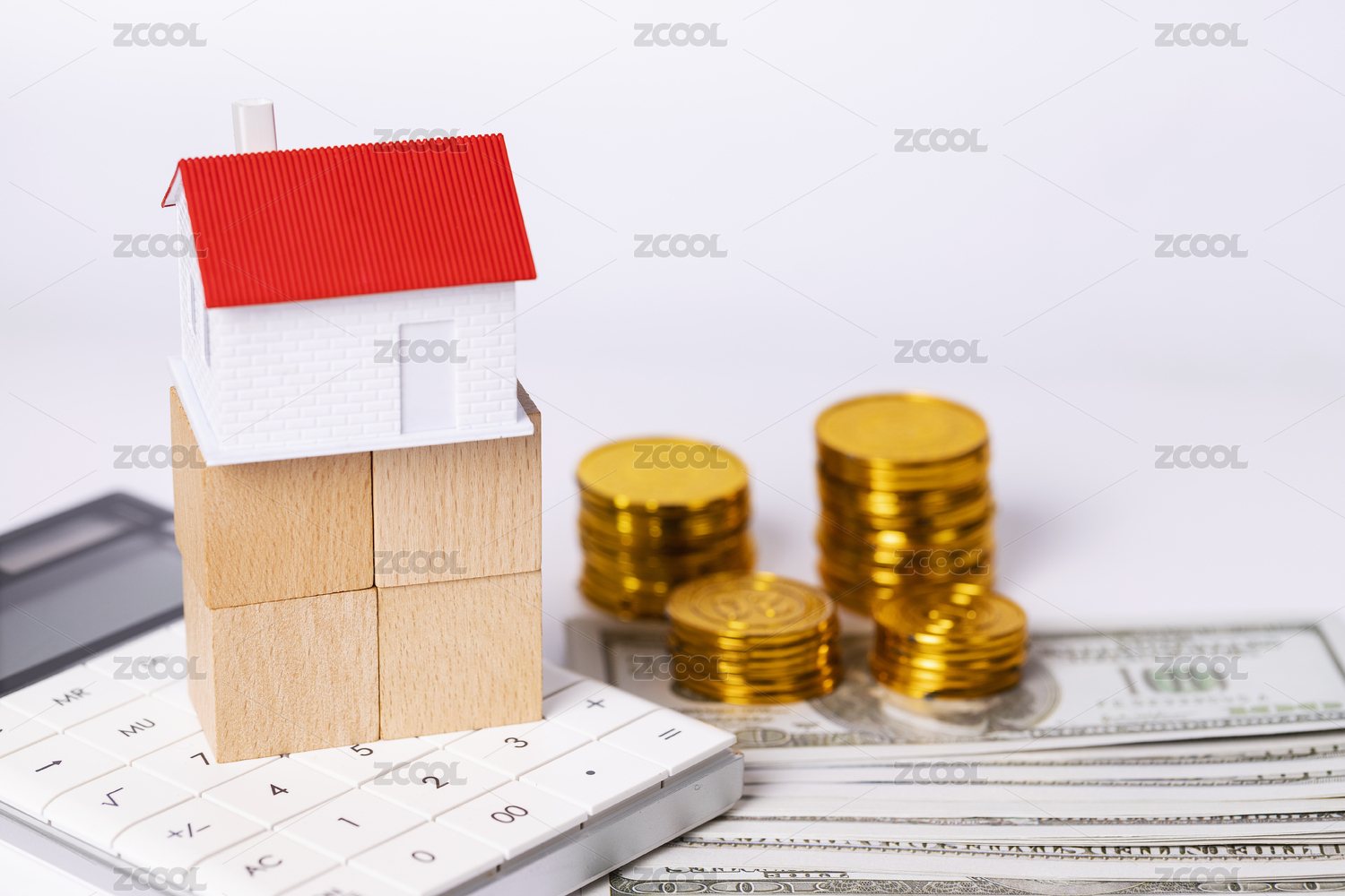 货币为底一座模型房屋一个计算器一把钥匙