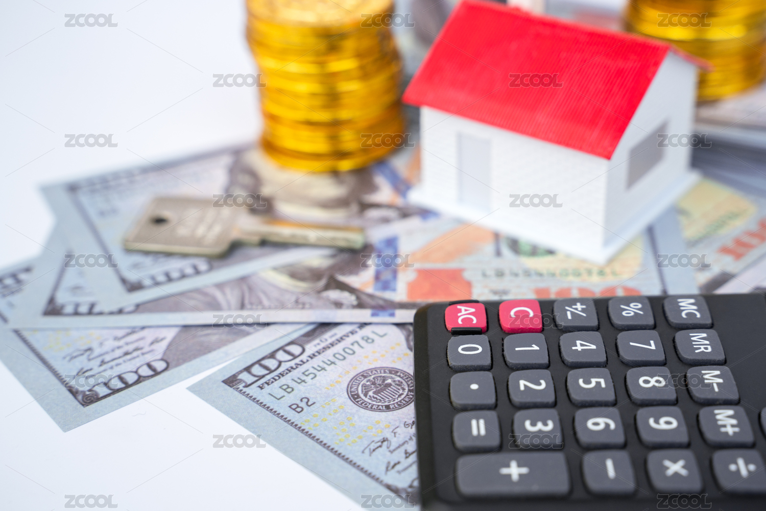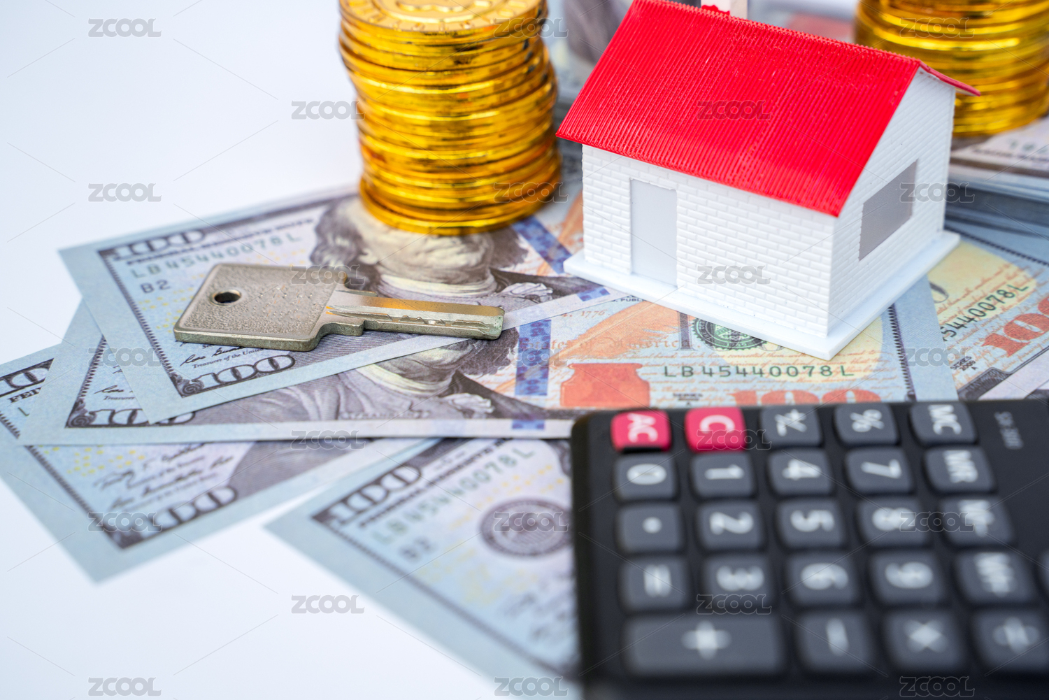 货币为底一把钥匙一个计算器与模型房屋