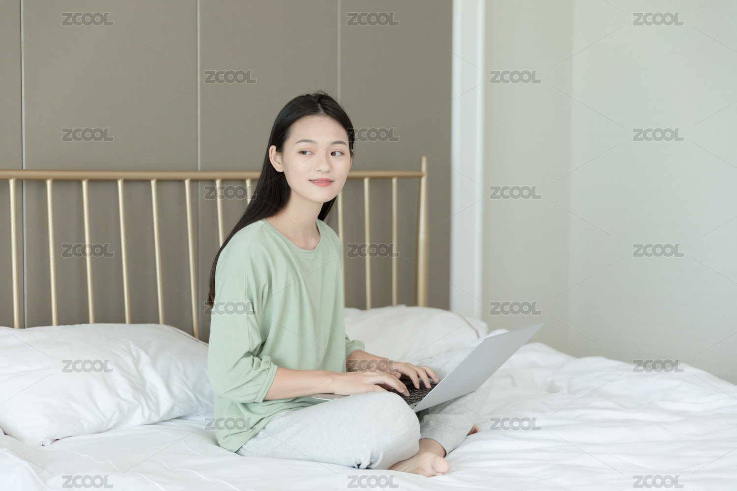 年轻女孩盘腿坐床上看电脑