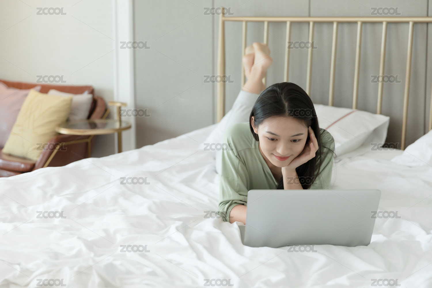 一位女生在卧室趴着玩电脑