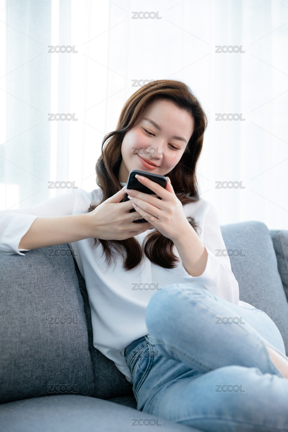 坐在沙发上正在使用手机的亚洲女孩