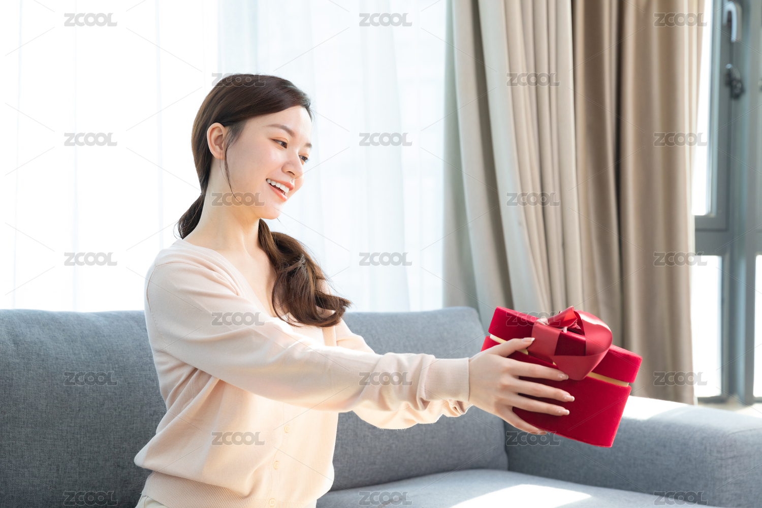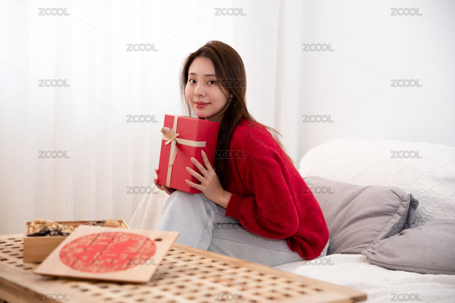 穿着白色毛衣的女孩打开礼物笑容灿烂
