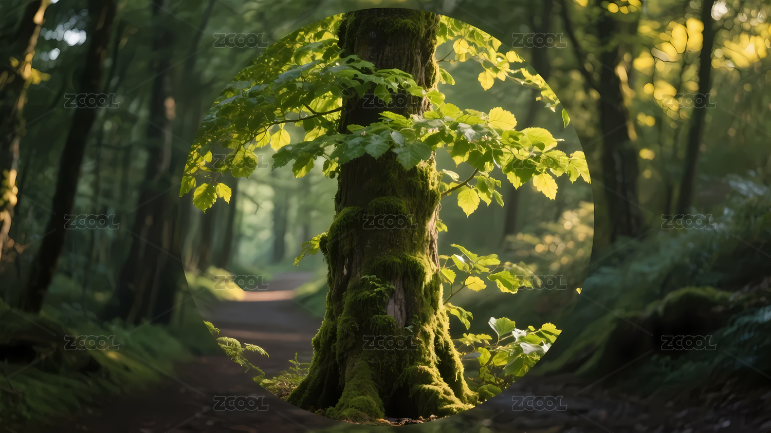 aigc,宁静,大气,照亮,树木,绿色,森林,苔藓,树桩,自然光