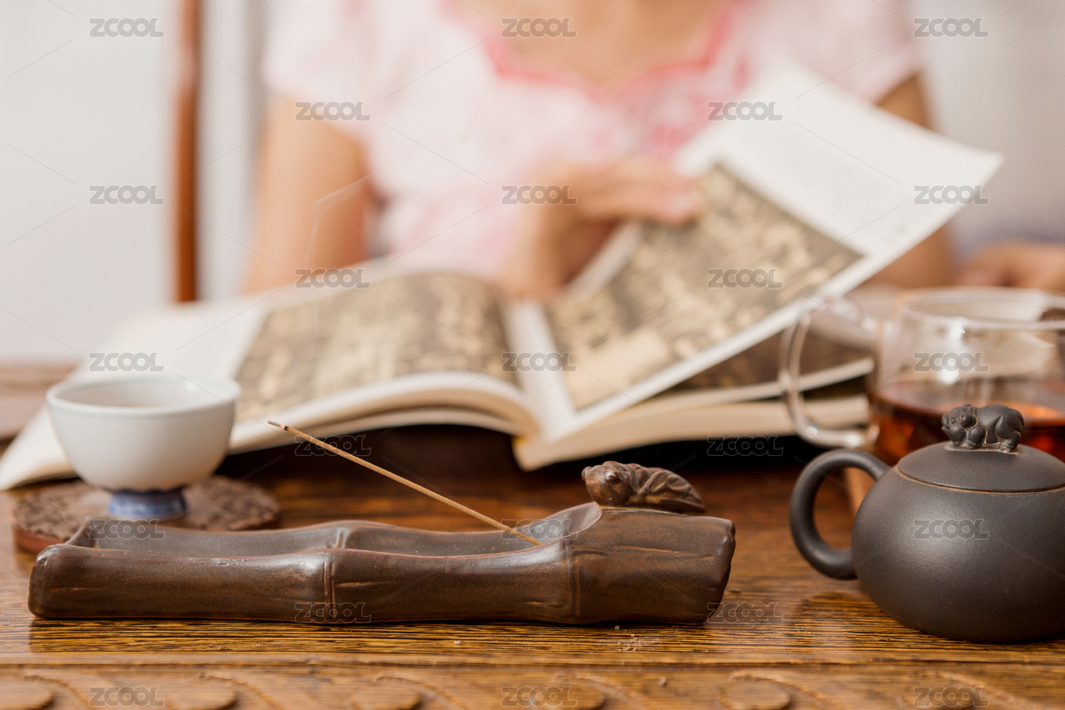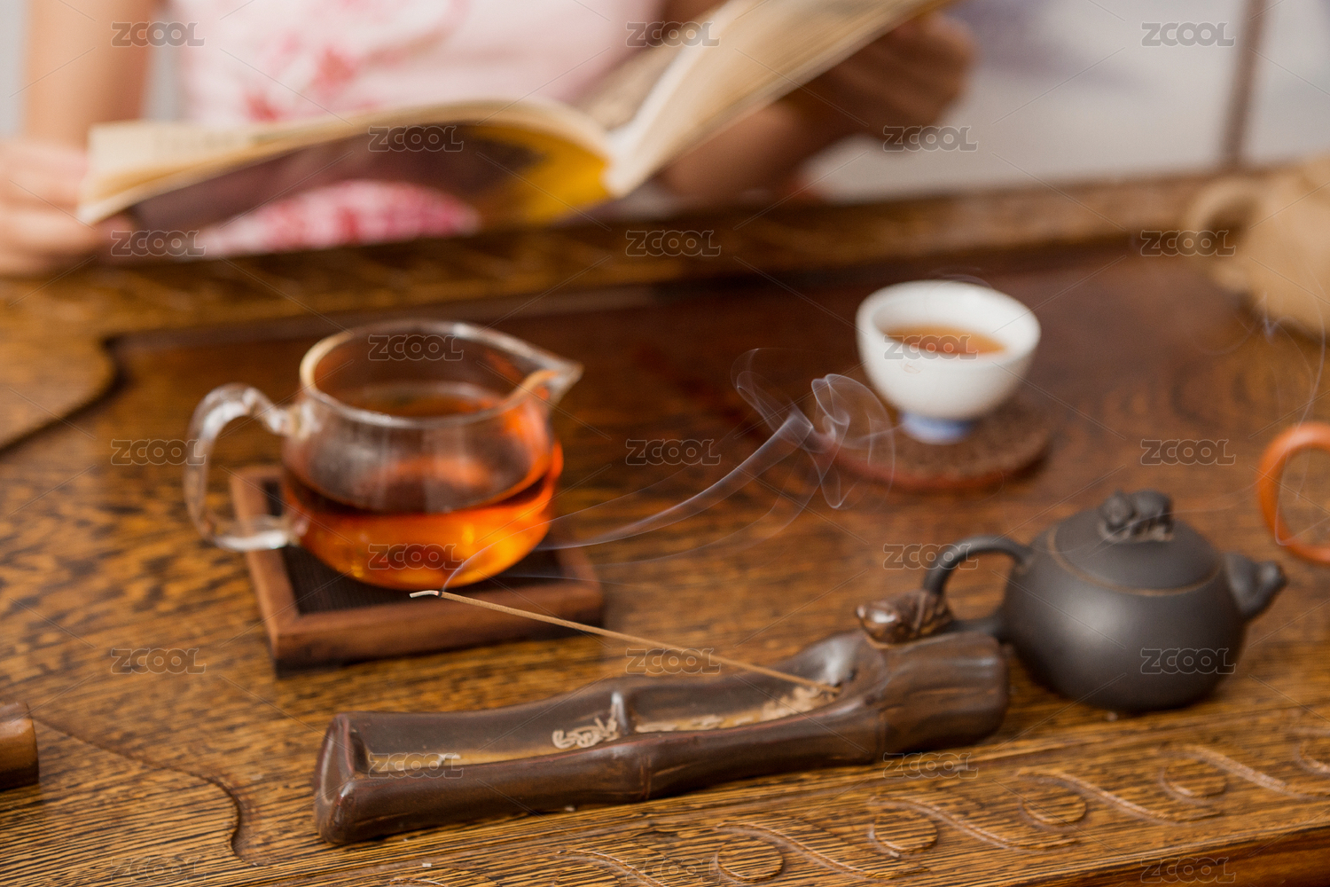 陶瓷茶具和袅袅飘散的沉香烟雾