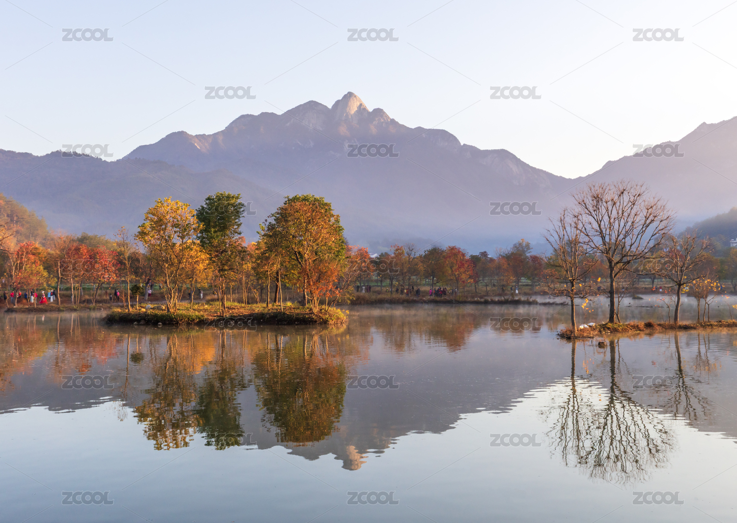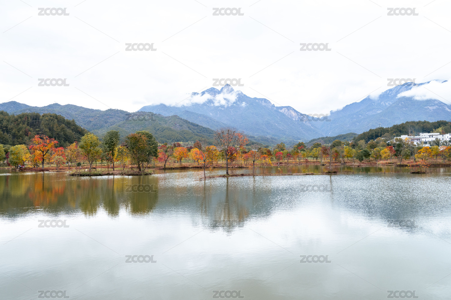 中国湖北黄冈罗田九资河镇河西畈村水中红叶秋景