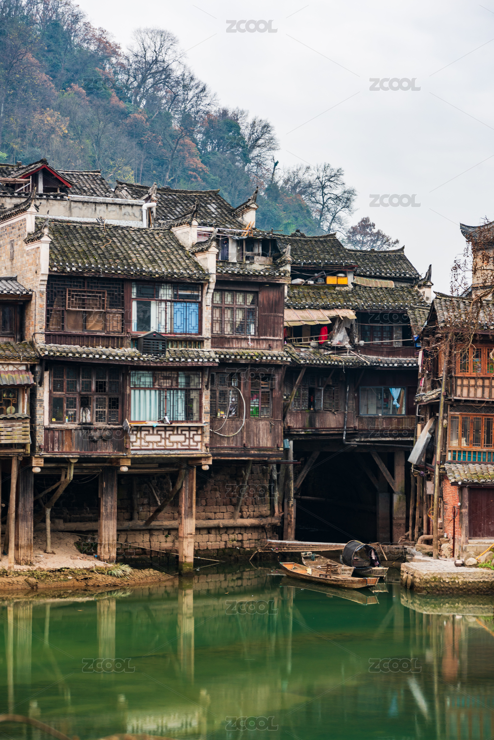 湖南湘西凤凰古城地标建筑景观——沱江及吊脚楼古建筑