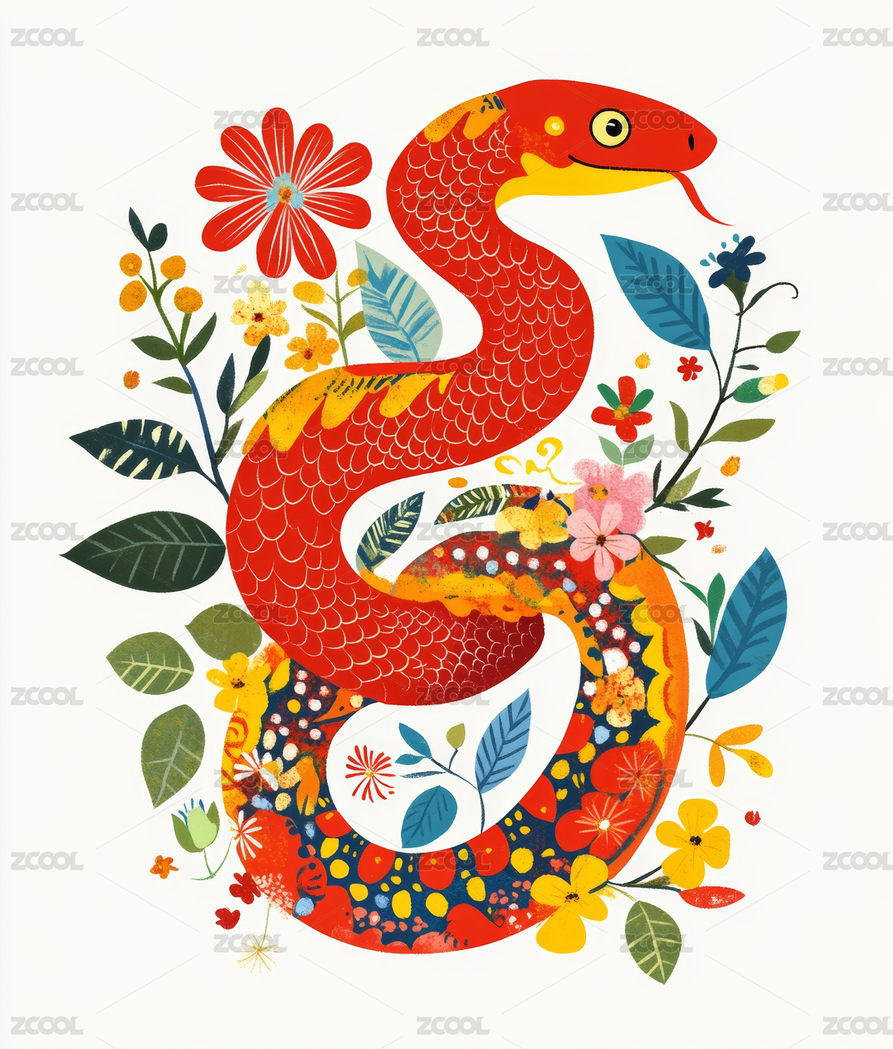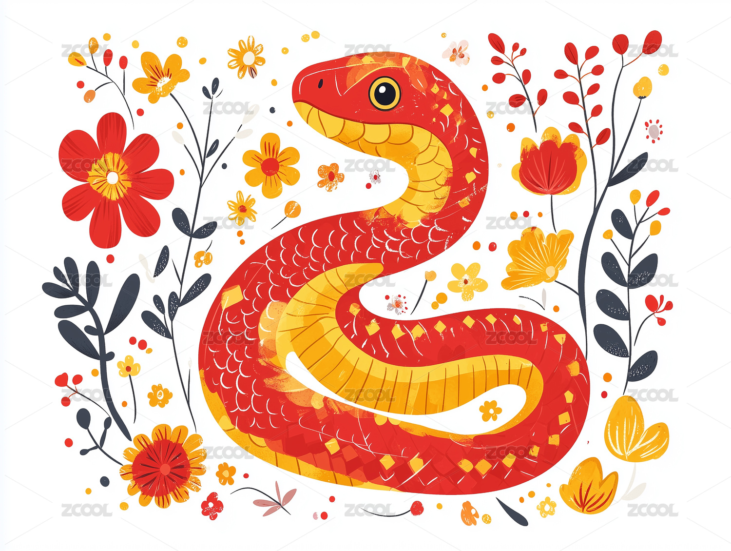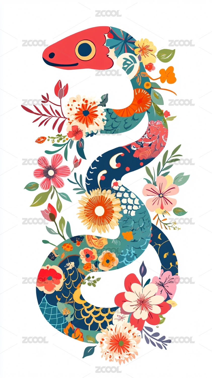 红色蛇与花卉环绕的插画