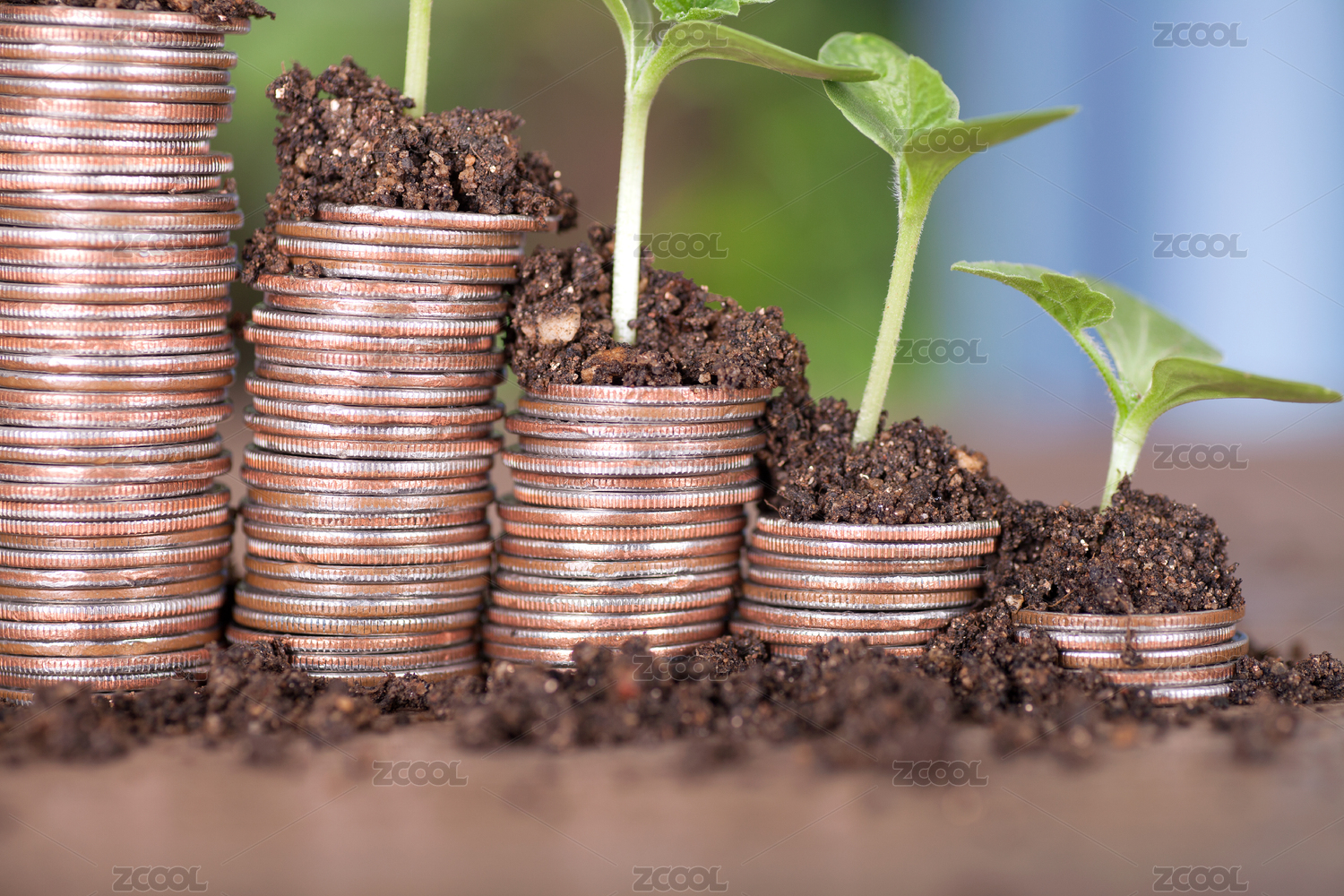 土壤里冒出一堆递增的美元硬币且硬币上都长出嫩芽