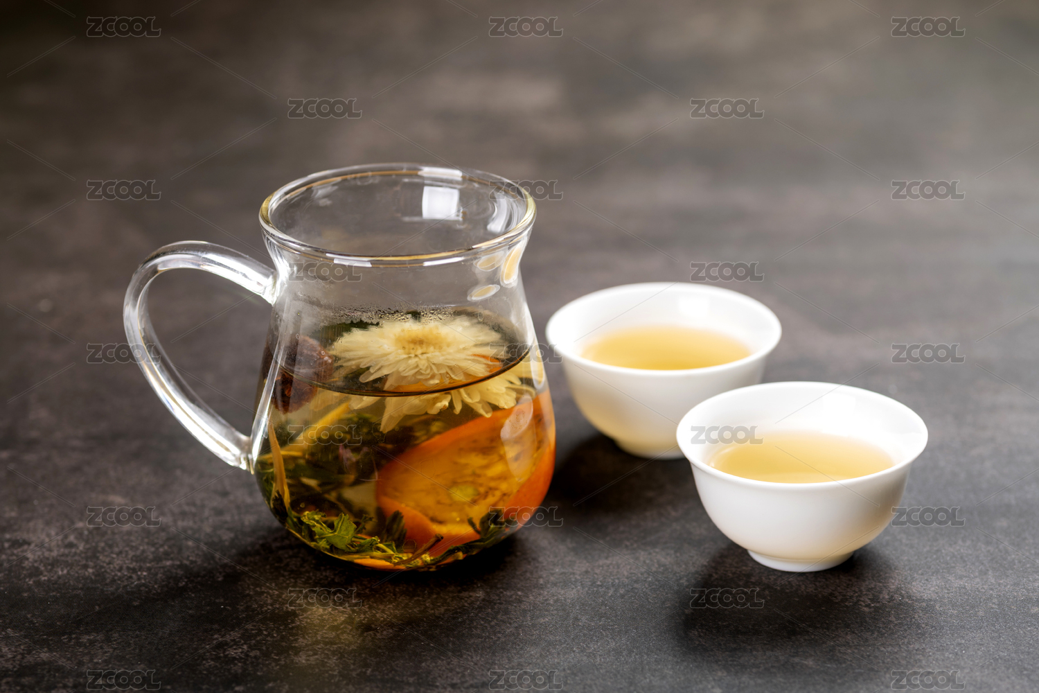 泡好的一壶绿茶和两个茶杯