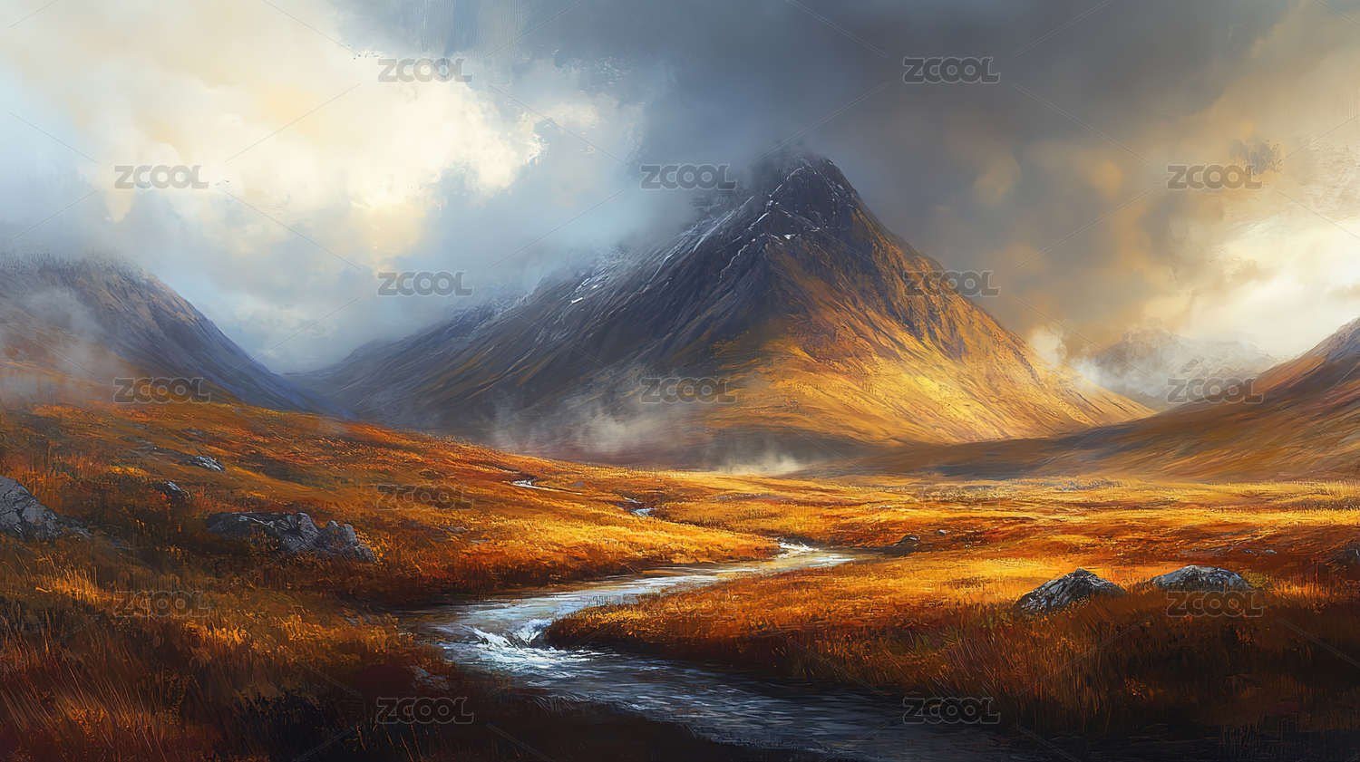 秋天的高原草原,烟雾缭绕的山和小河背景