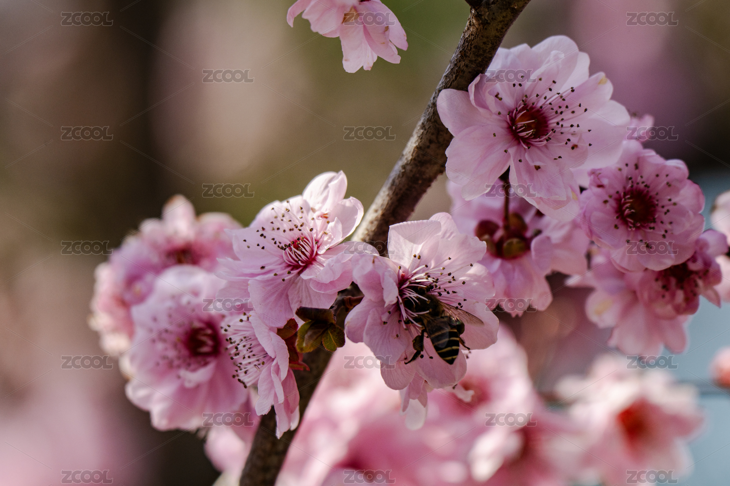 春天蜜蜂在粉色樱花上授粉采蜜微距