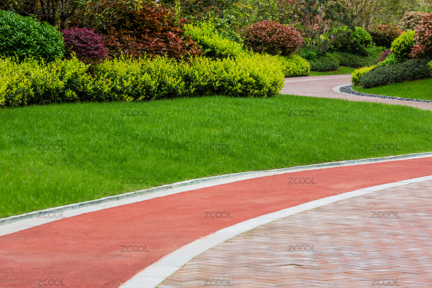 小区住宅里弯曲的步行道,砖路边绿色草坪,园林景观设计