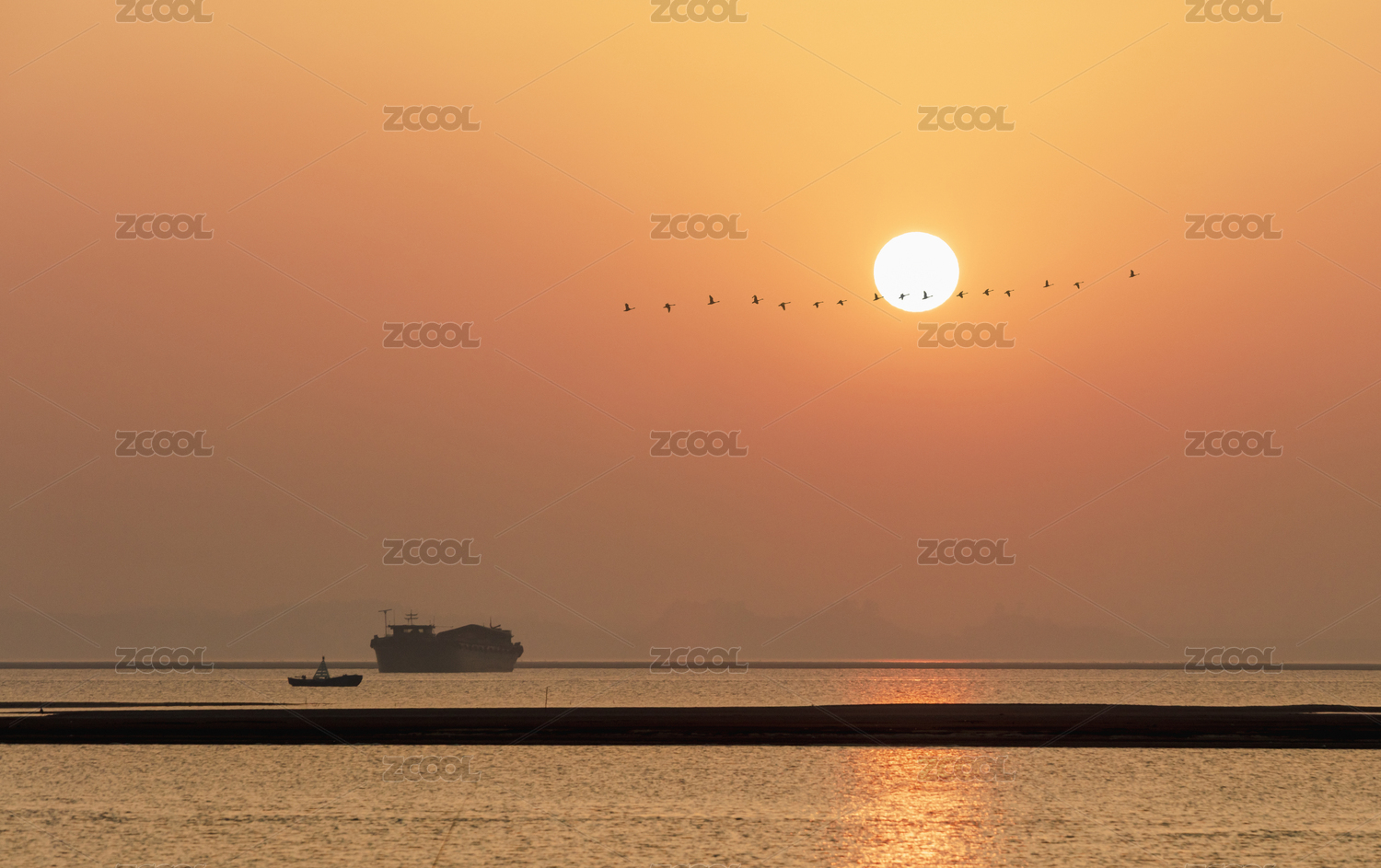 日落与一群飞行的大雁