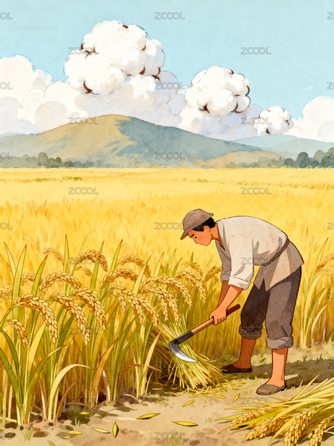 AIGC202402,秋天,秋收,农民,小麦,麦子,卡通,插画,浇水