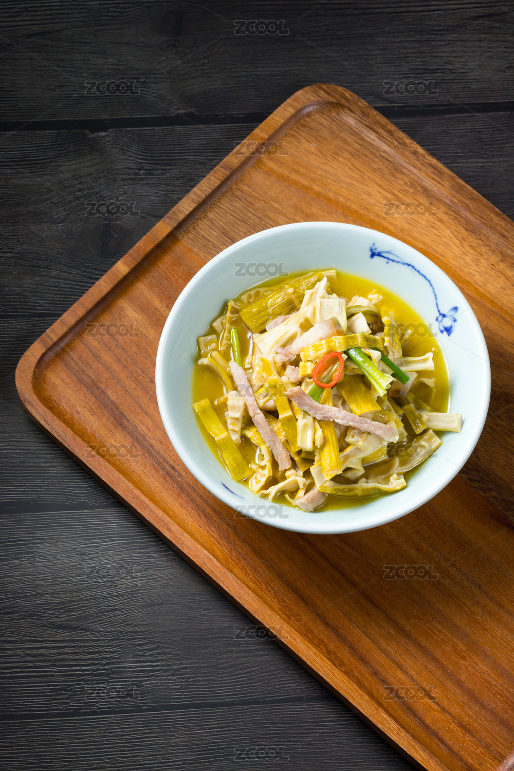 暗色调背景木盘上竹笋炒肉