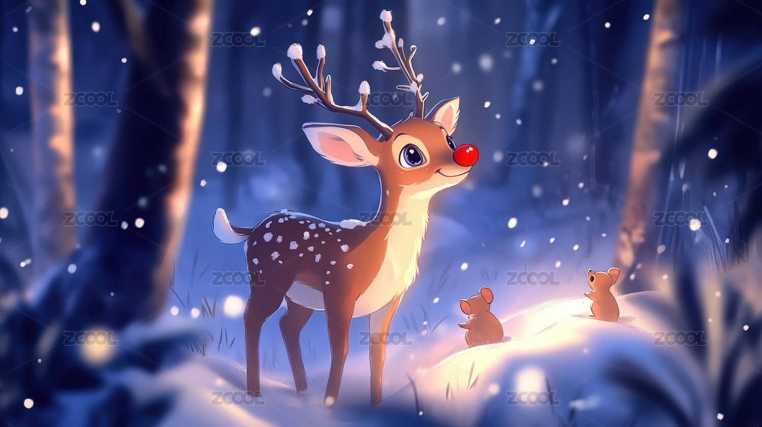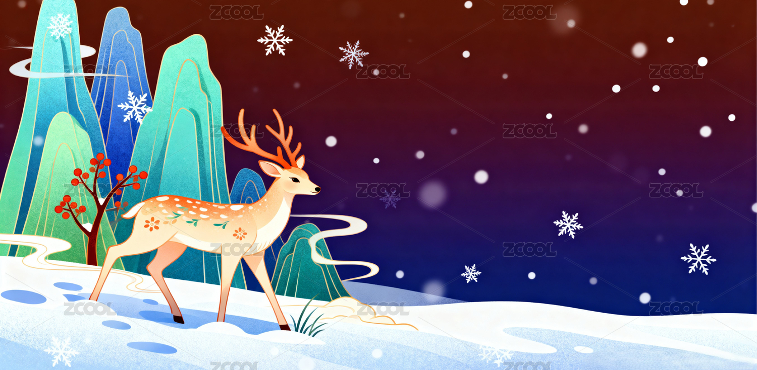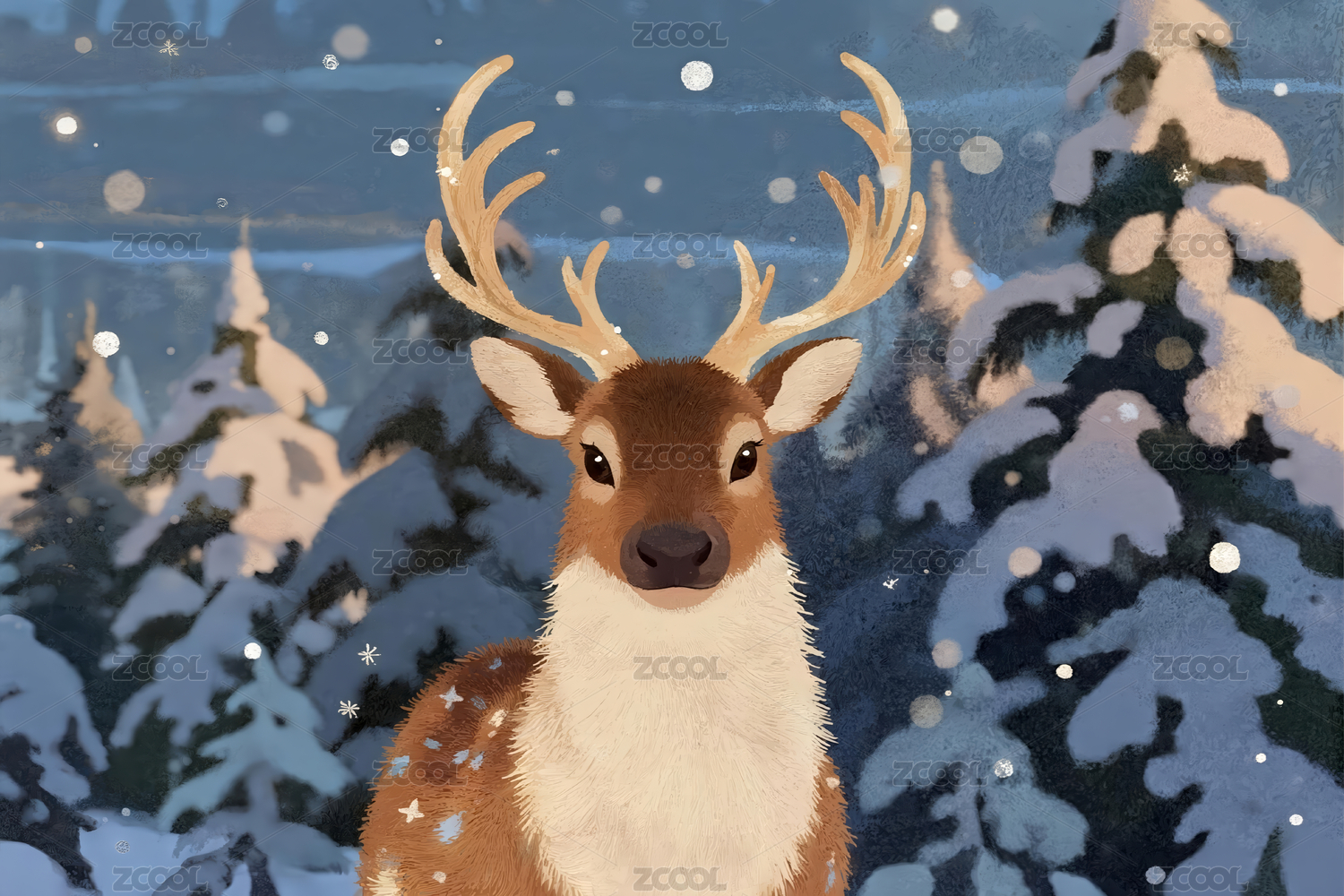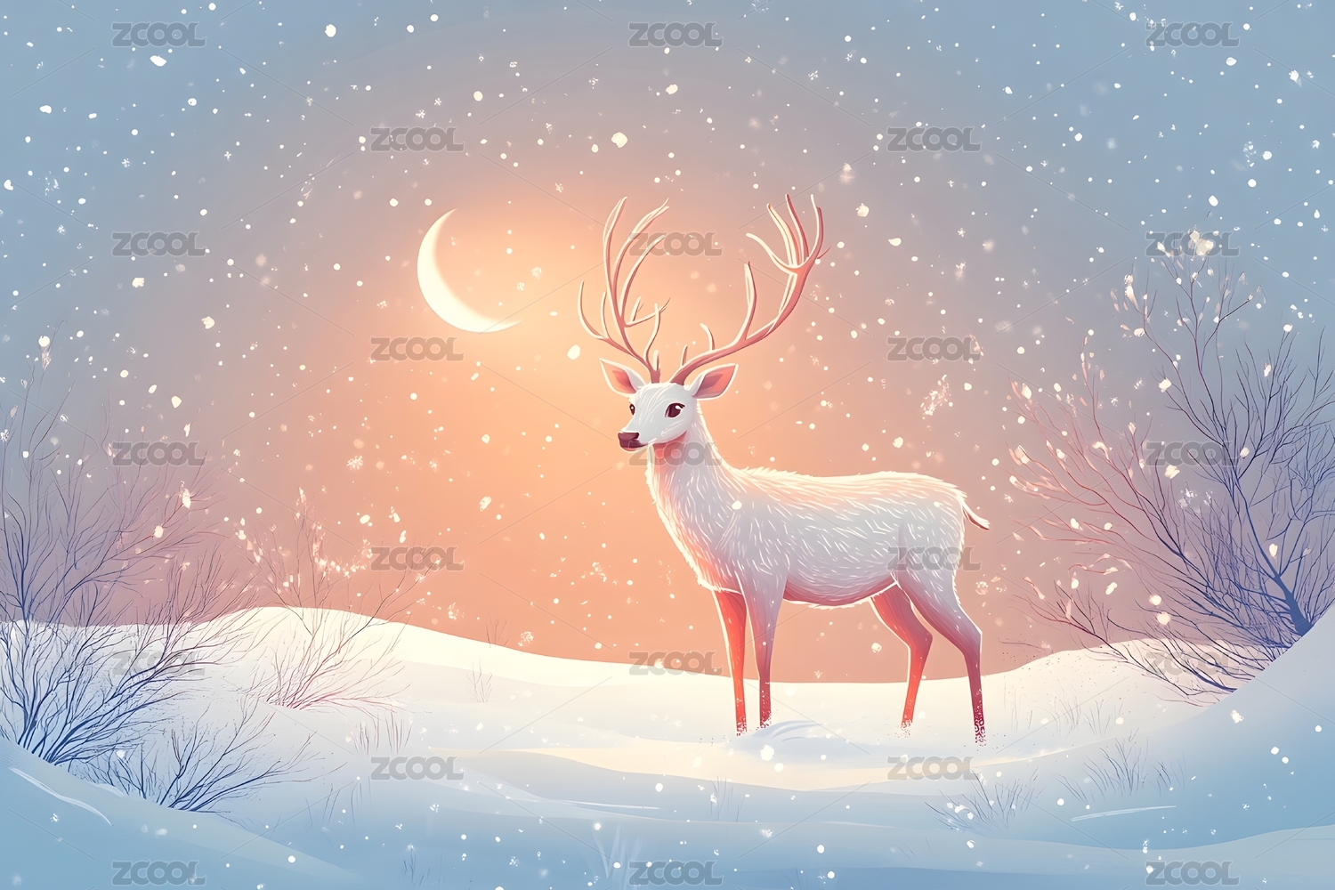 雪地上一只鹿雪花树枝蓝色夜空三维插画