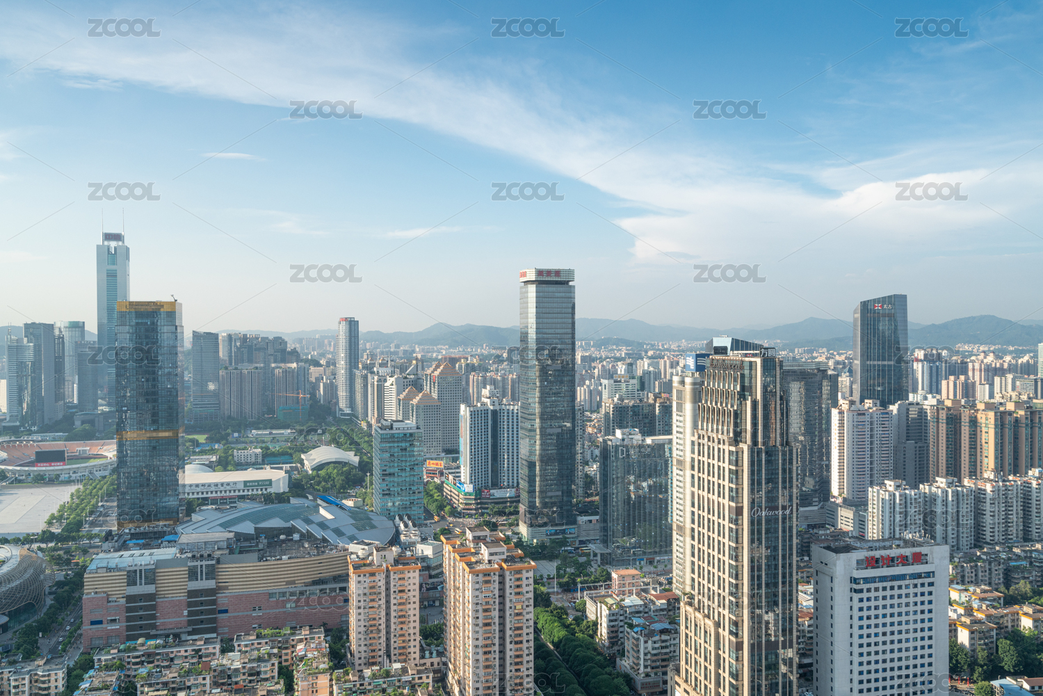 蓝天白云下的中国广东省深圳城市建筑天际线高楼大厦风光
