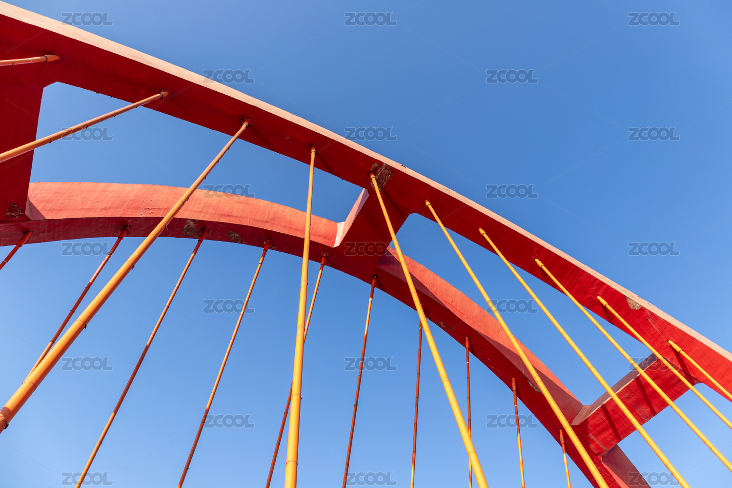 晴空下仰视广州猎德大桥桥墩顶部局部与缆线