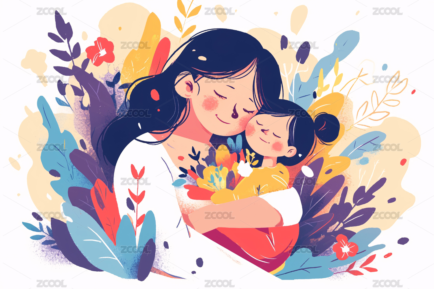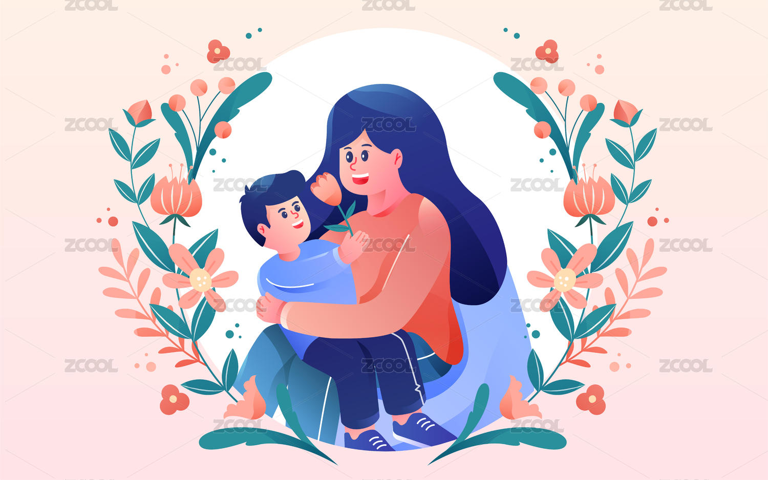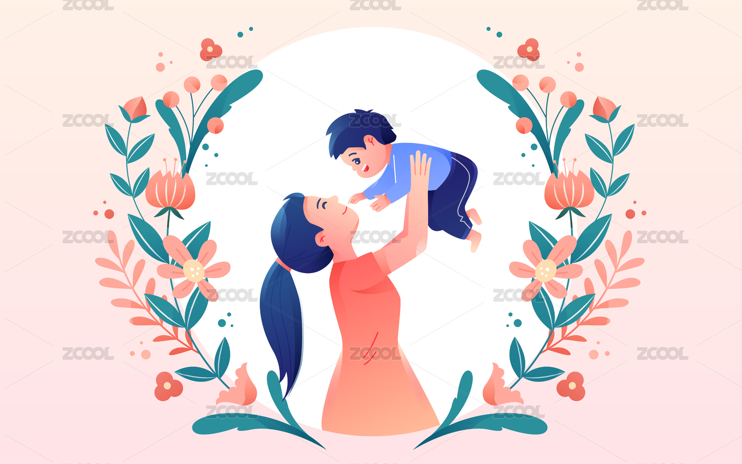 母亲怀抱着小孩鲜花环绕母亲节温馨插画
