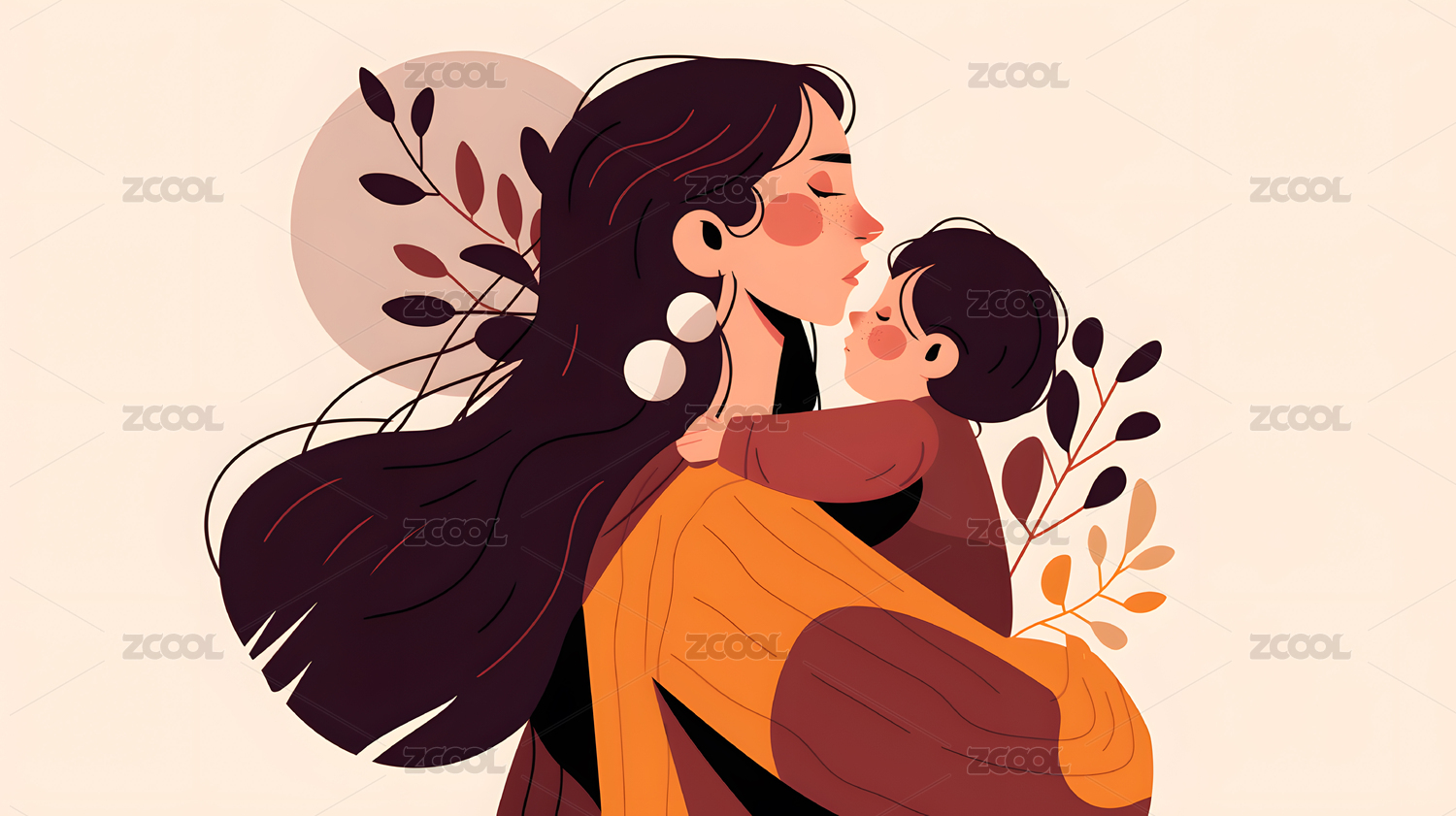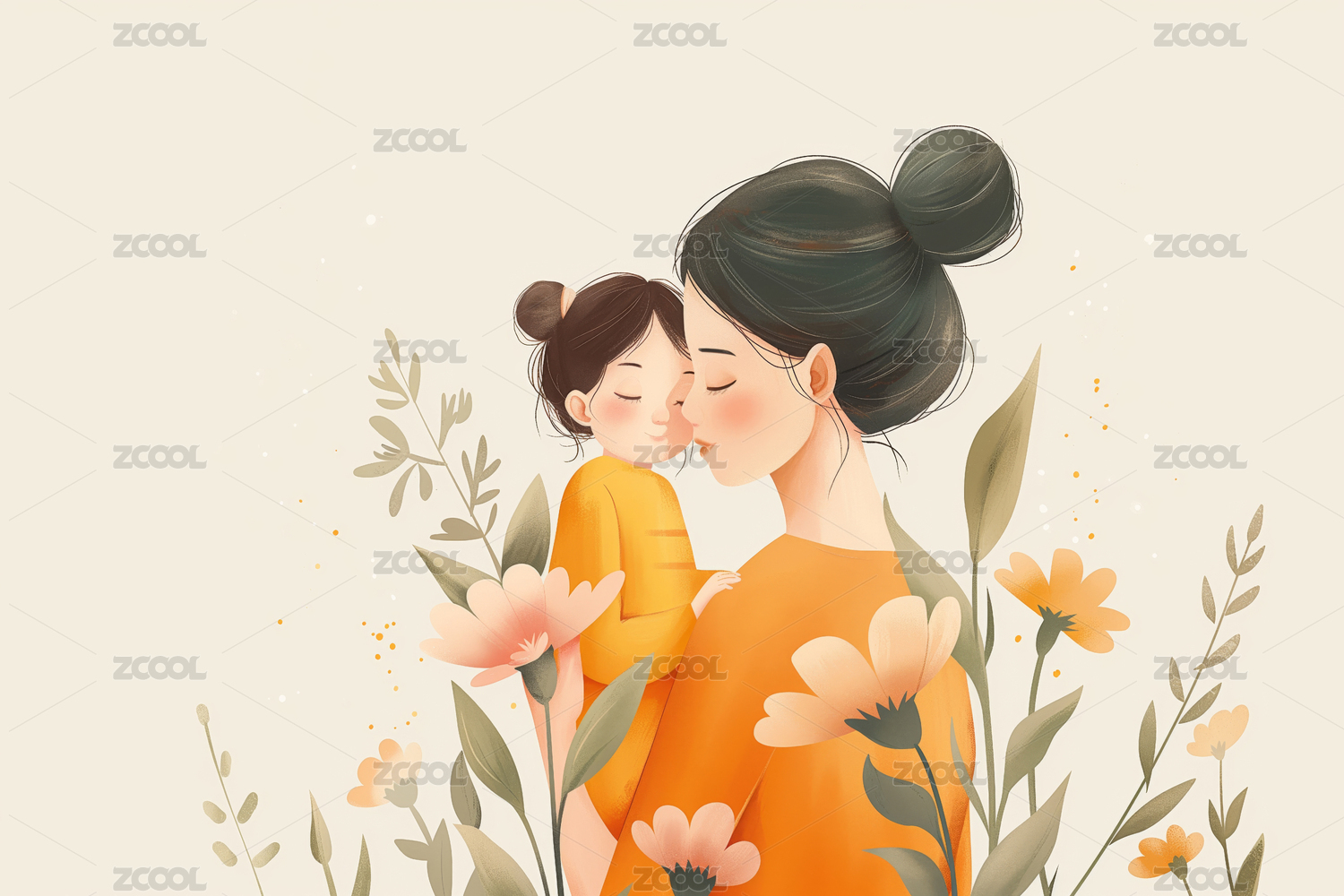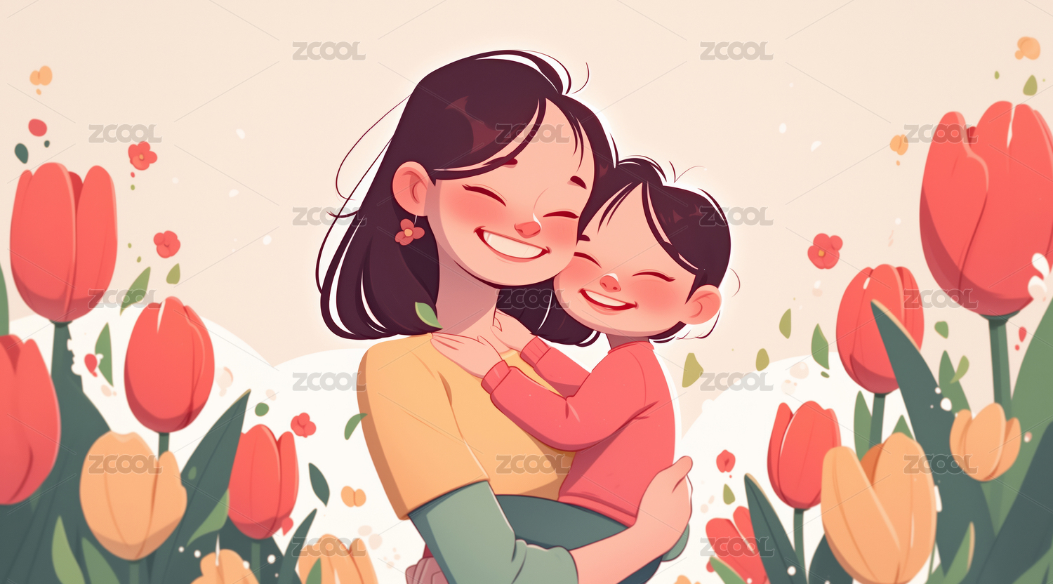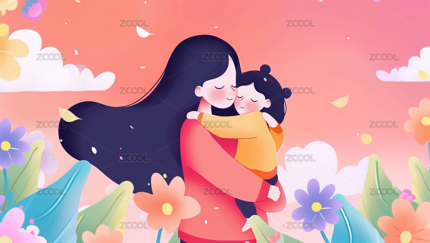 母亲怀抱着小孩鲜花环绕母亲节温馨插画