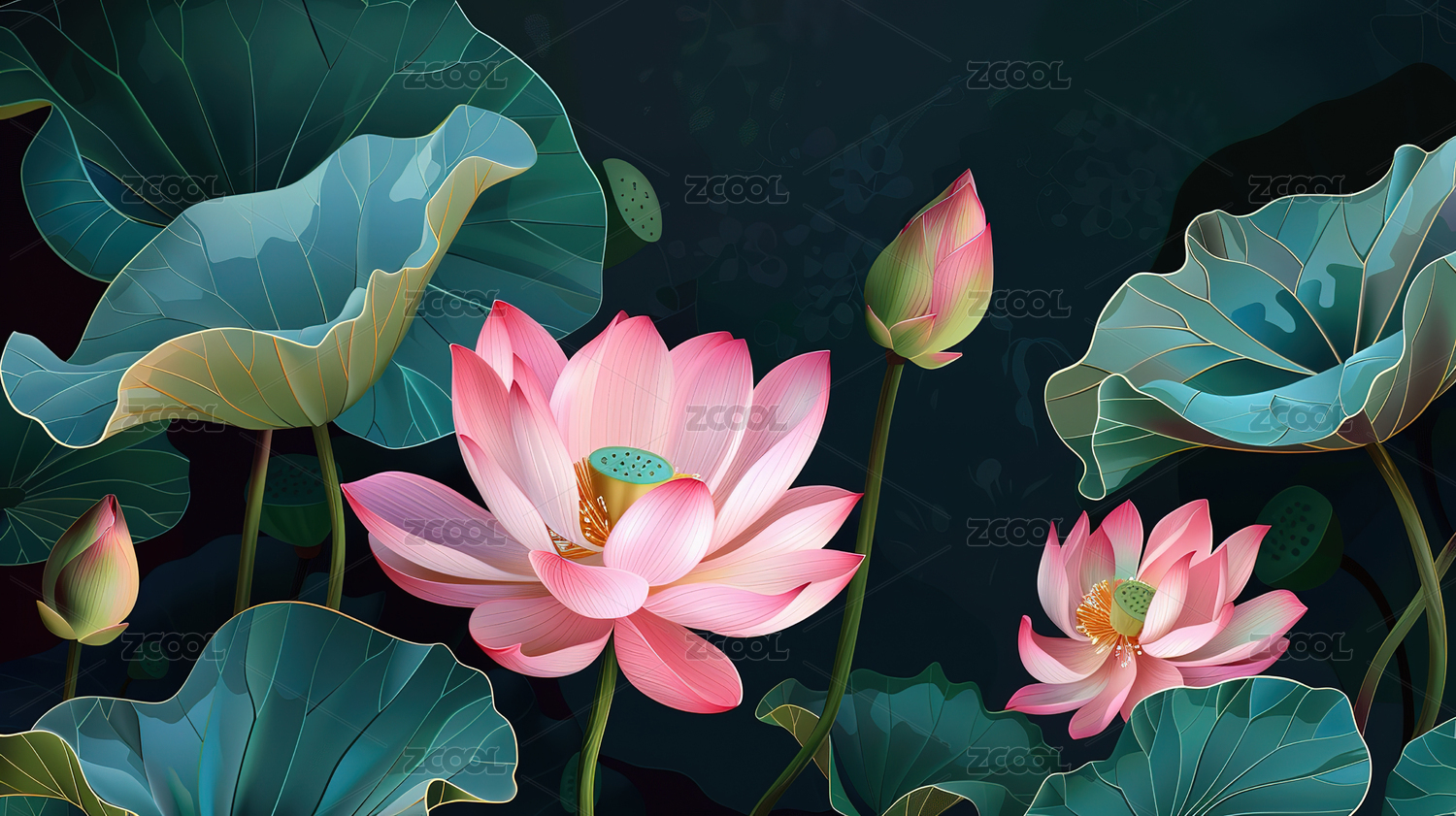 国潮花卉中式传统绘画植物插画荷花夏暑莲花