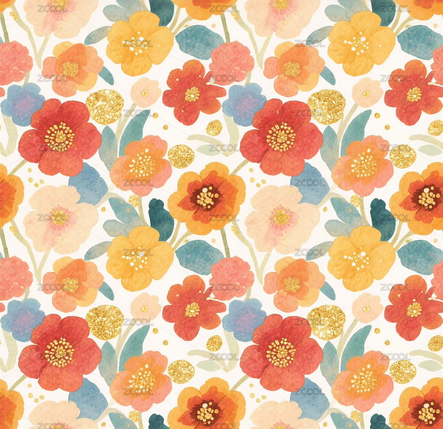 水彩花卉满印四方连续无缝图案
