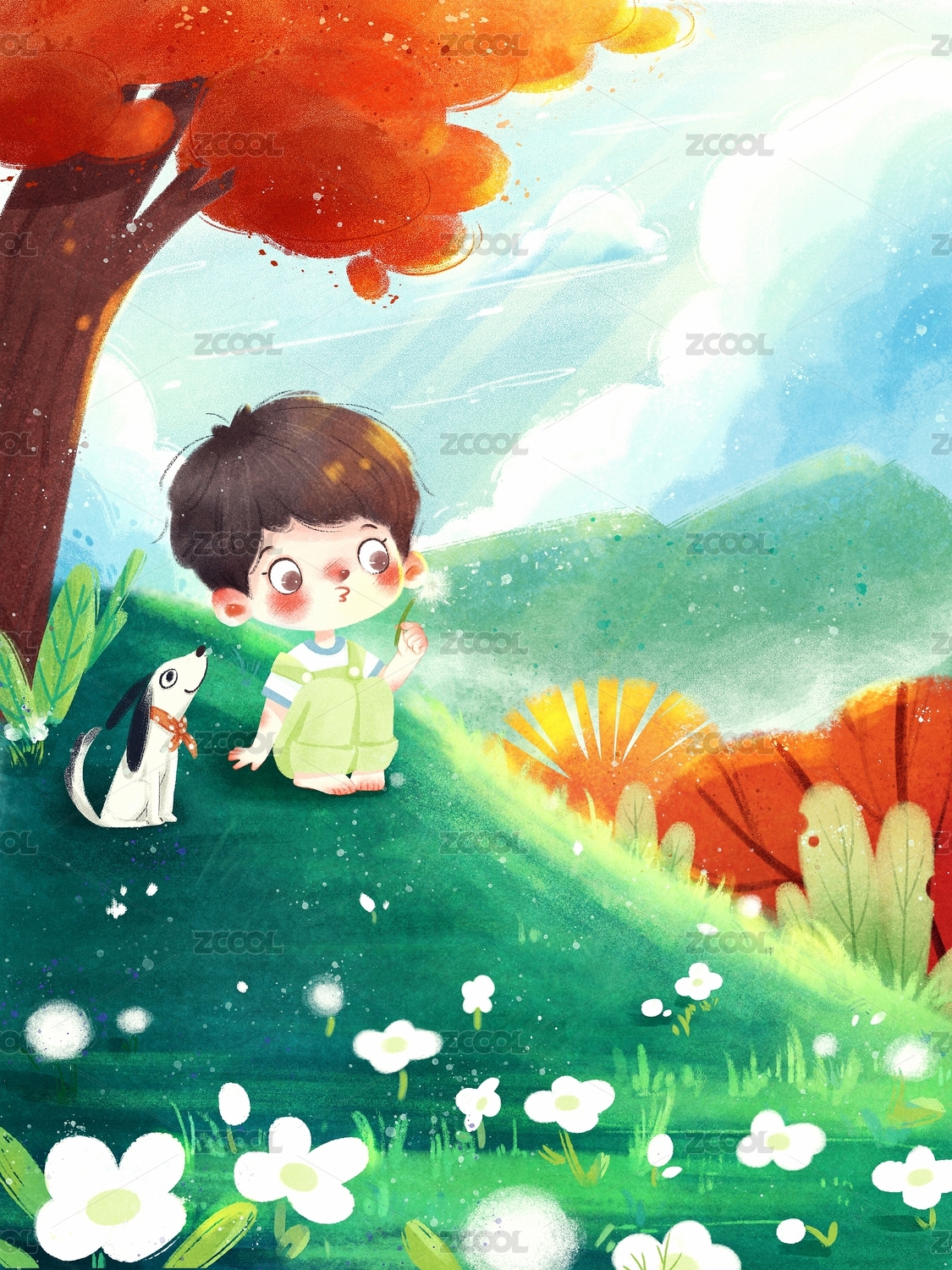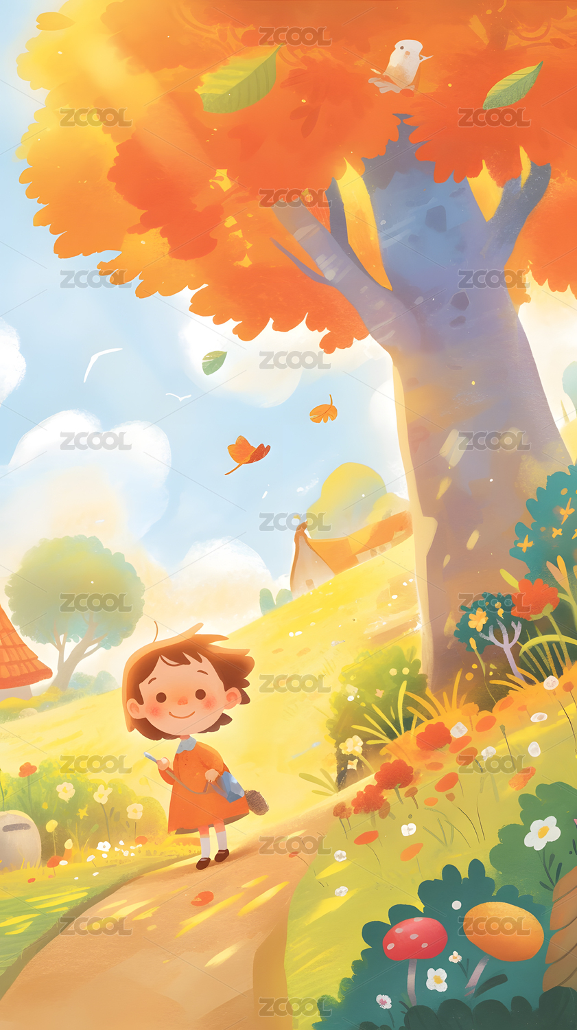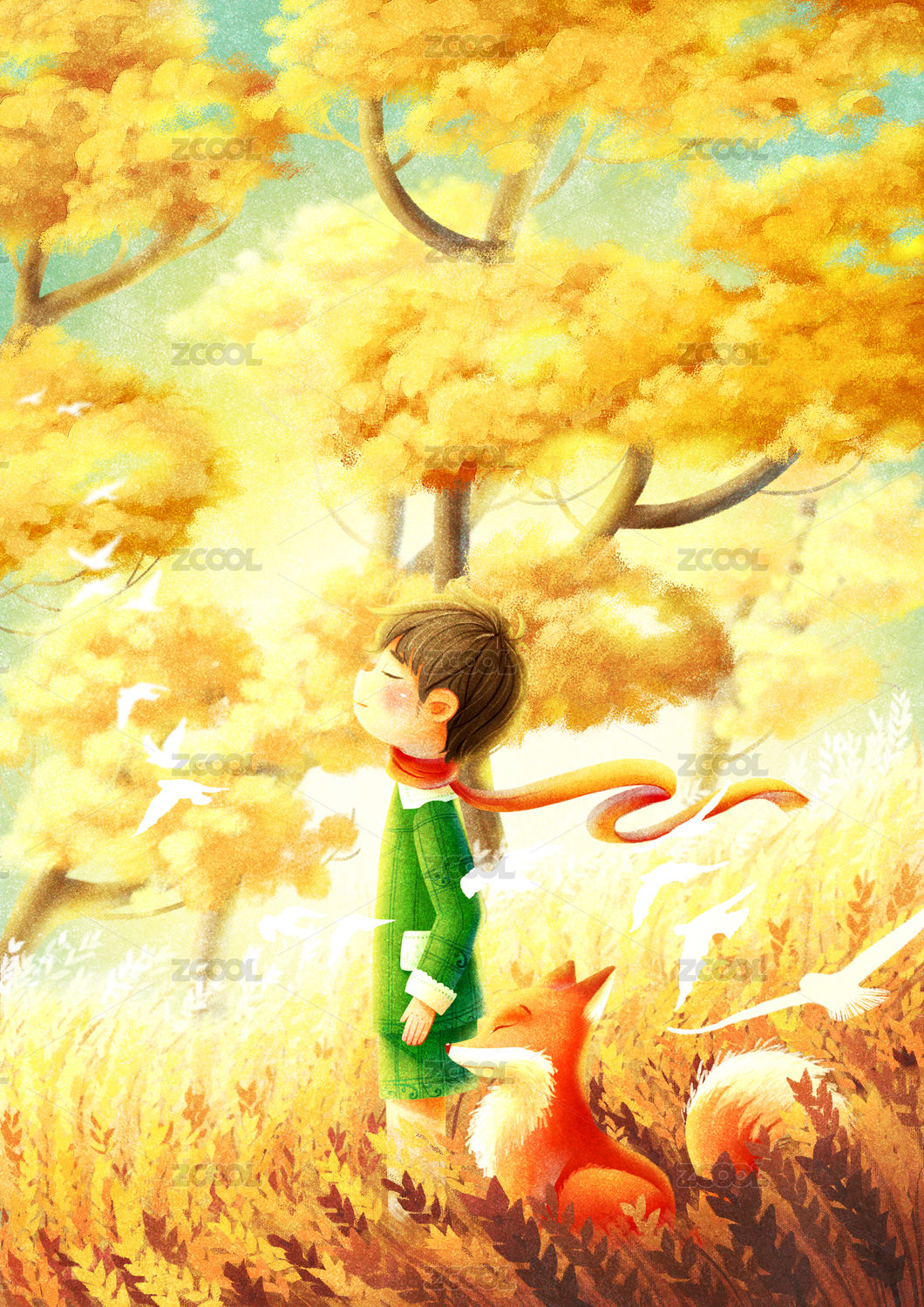 唯美秋天小男孩和松鼠在森林中收集树叶