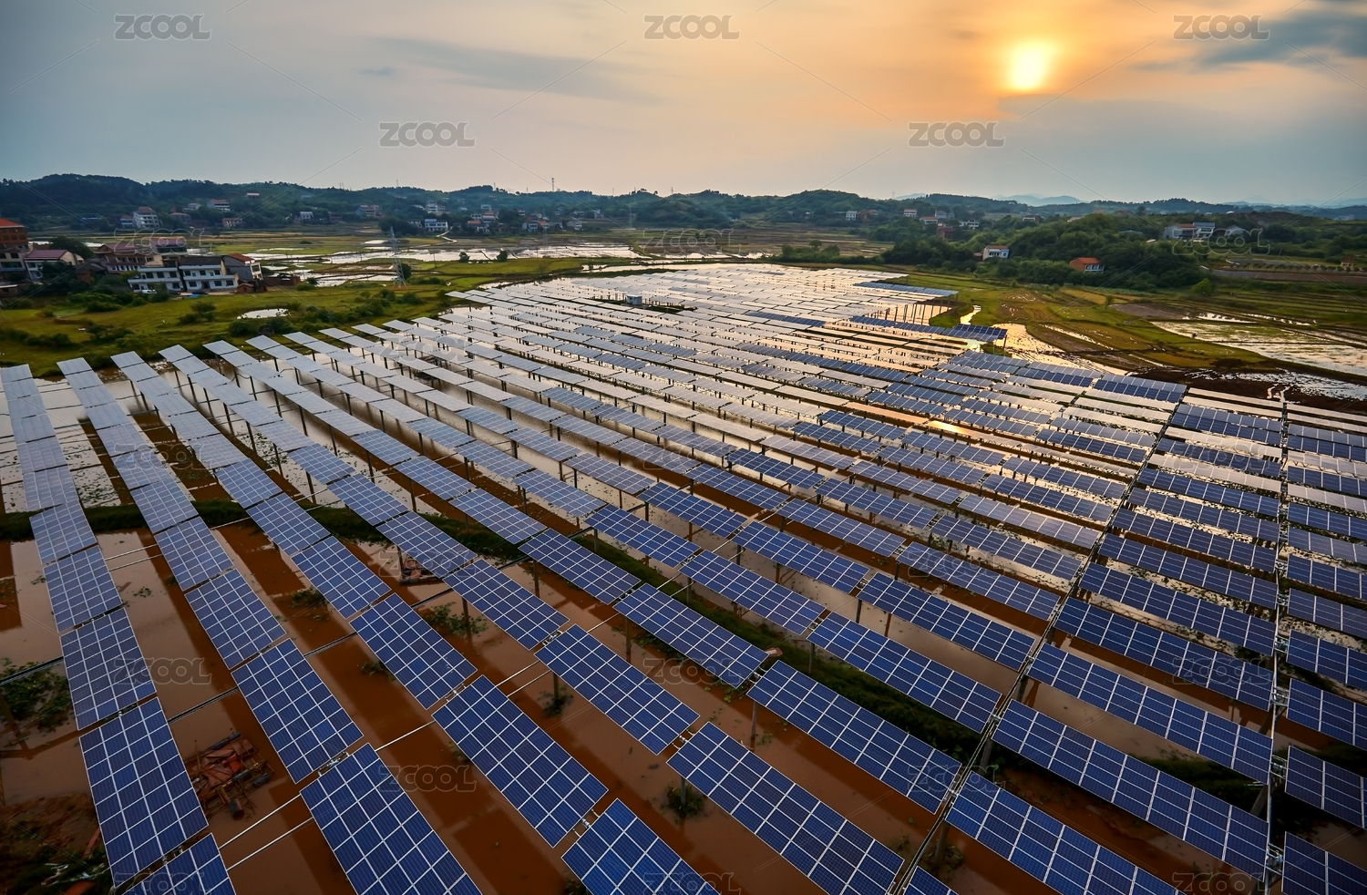 航拍夕阳下的太阳能光伏电池面板