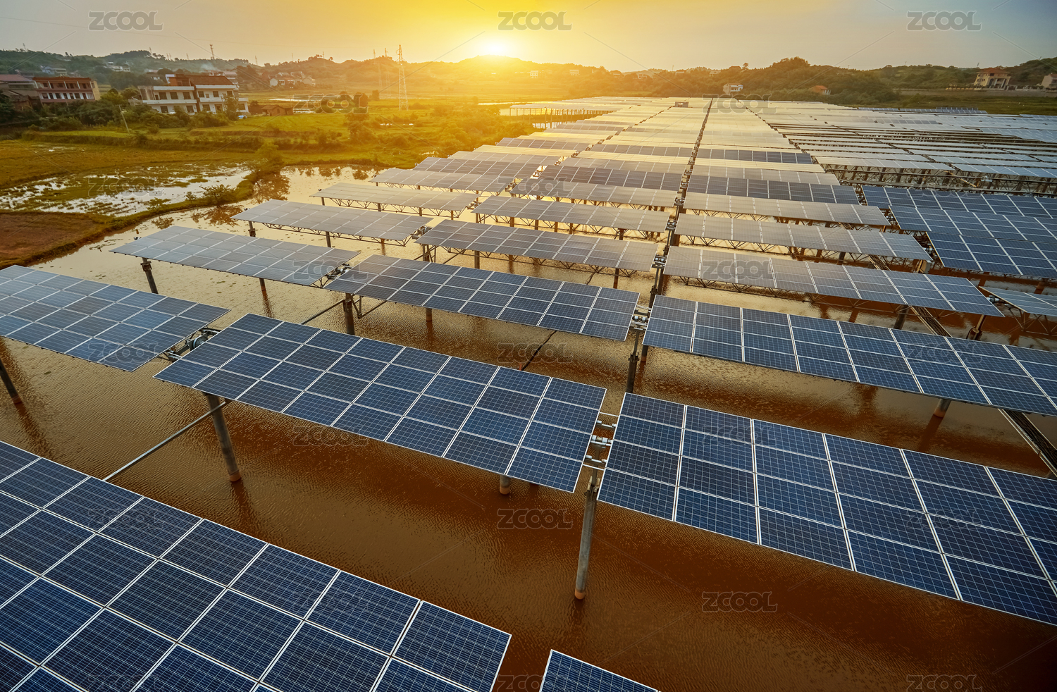 航拍夕阳西下的农村湖面太阳能光伏电站