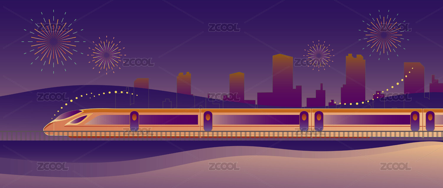 高铁城市交通现代建筑矢量夜晚户外横幅插画