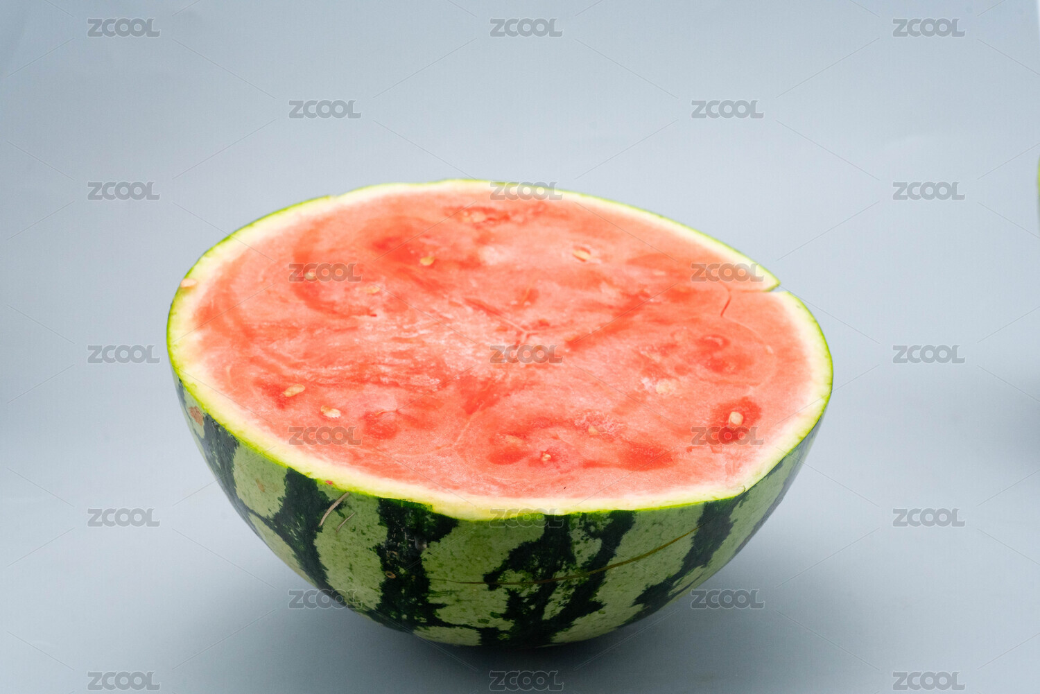 蓝色背景上,切开一半的夏日水果西瓜特写