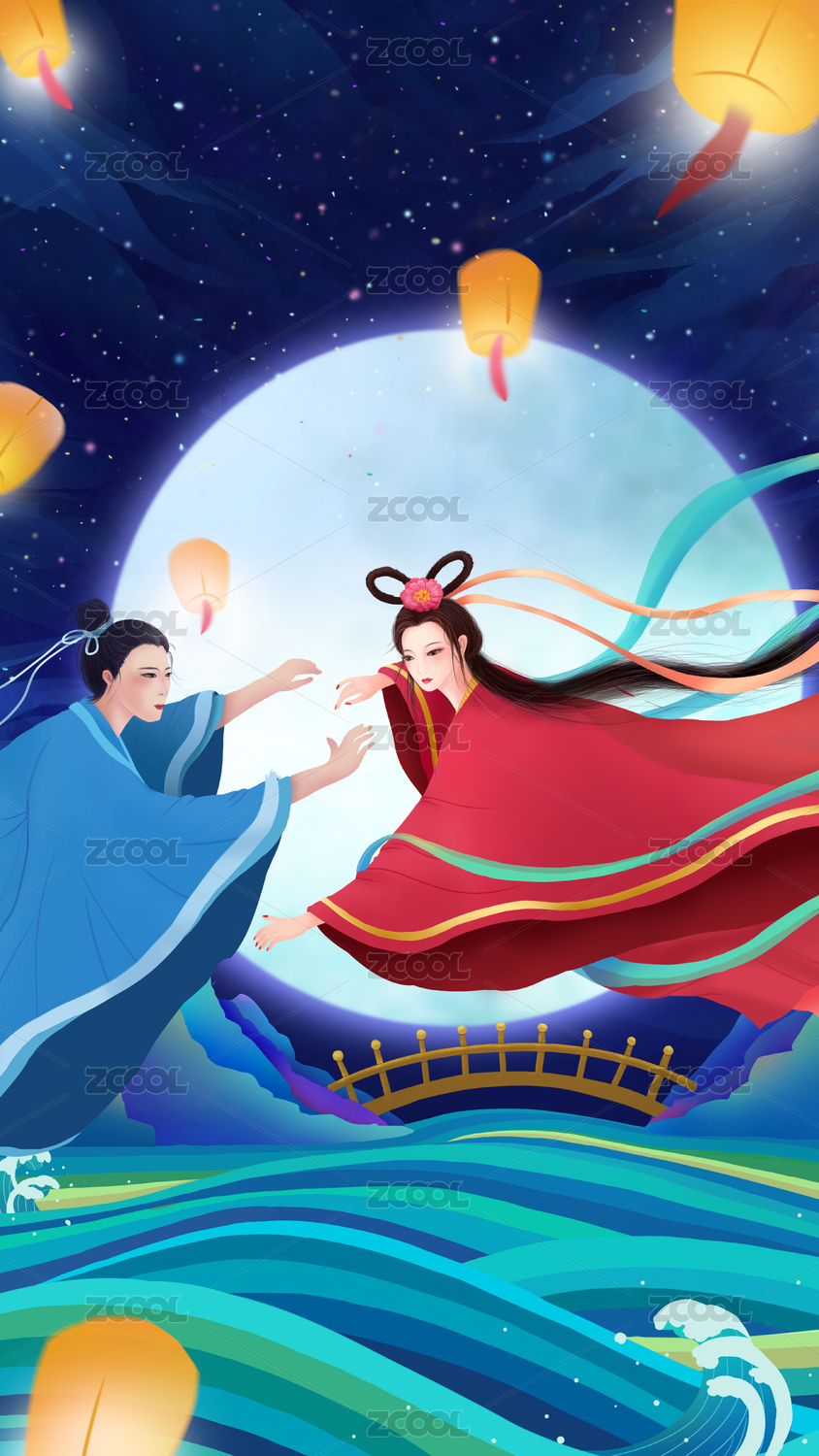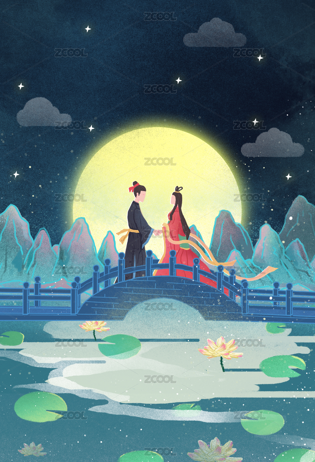 中国风七夕节在桥梁上牵手赏月的牛郎织女