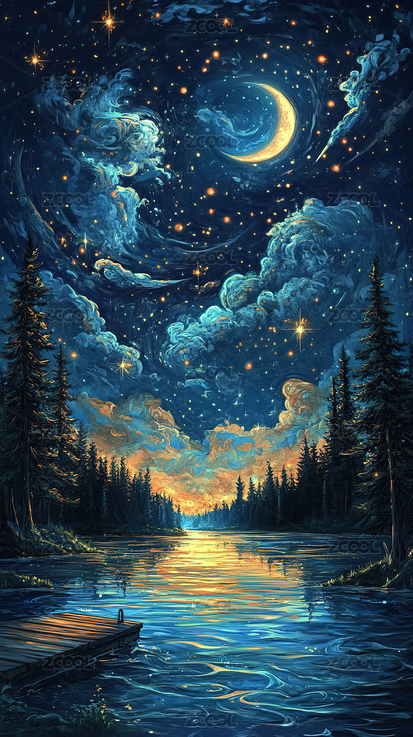 星夜湖畔森林宁静美景