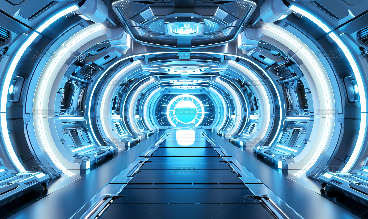 蓝色科幻空间太空仓内部,科技空间广场平台
