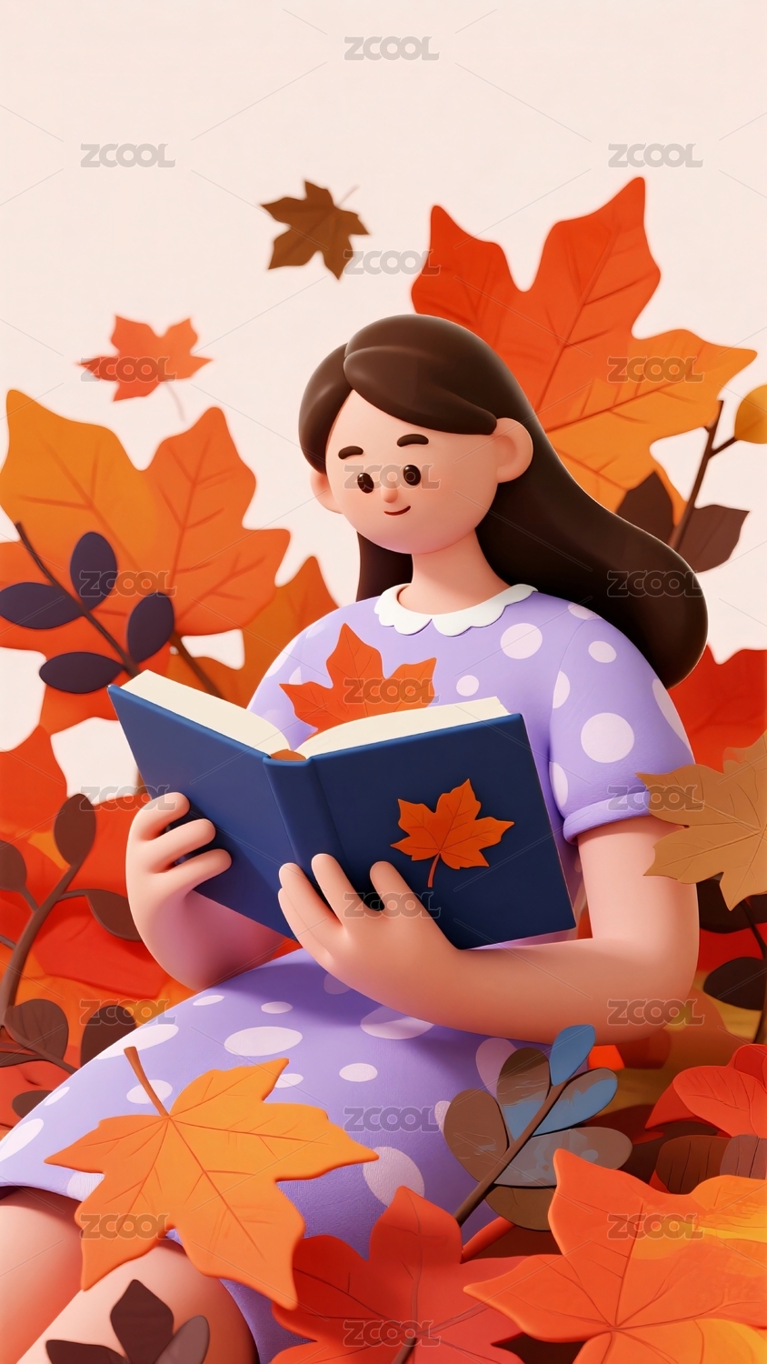 女孩读书秋季落叶环绕