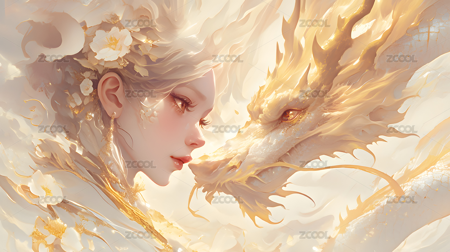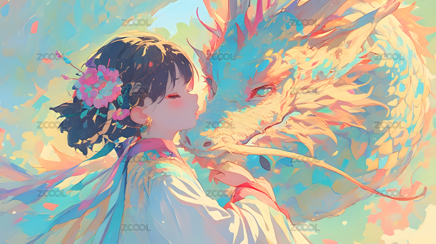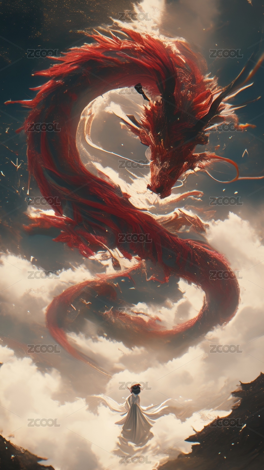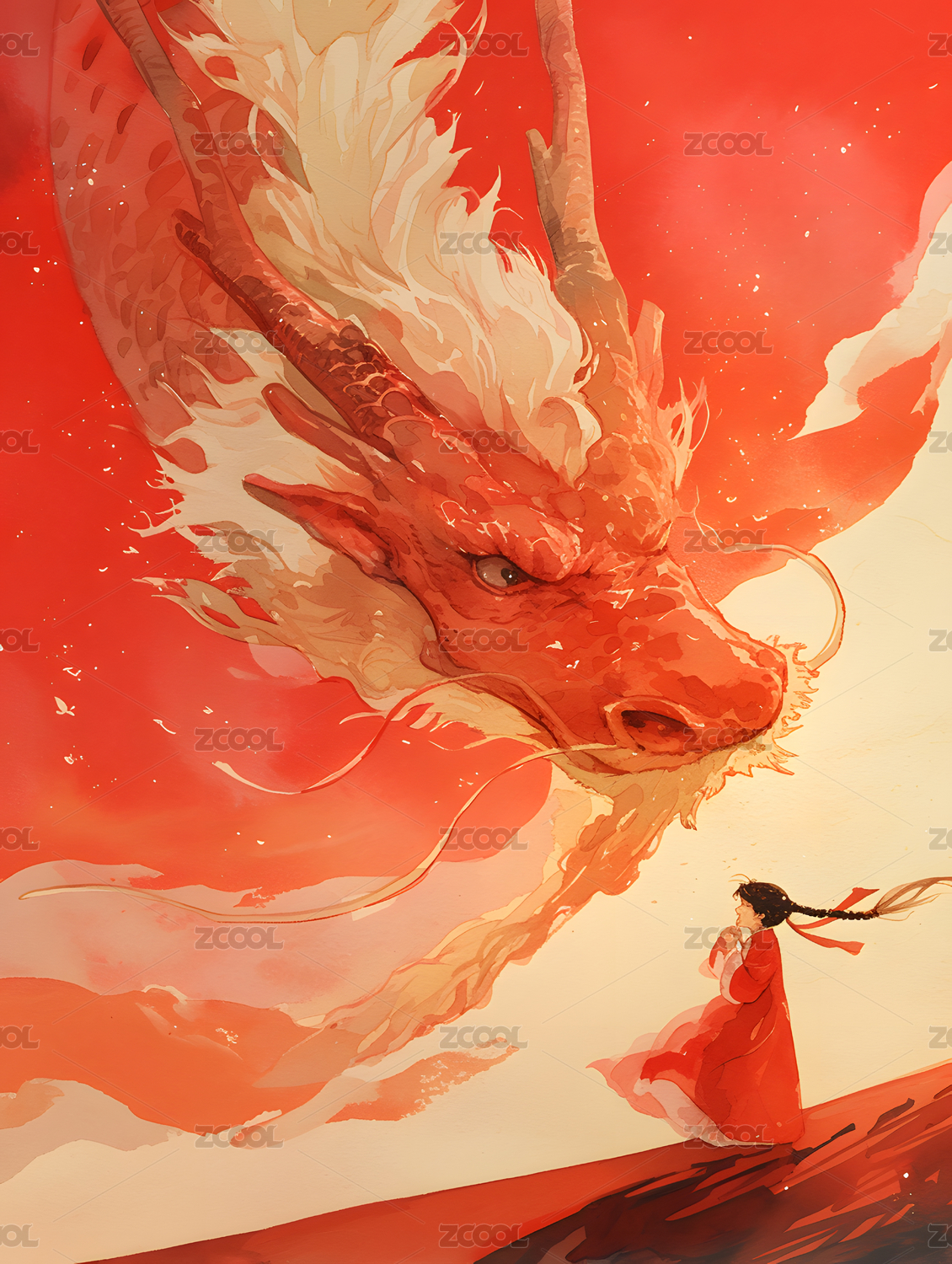 绘画,女孩,东方,神龙,红色,白色,祥和,冥想,守护,灵性