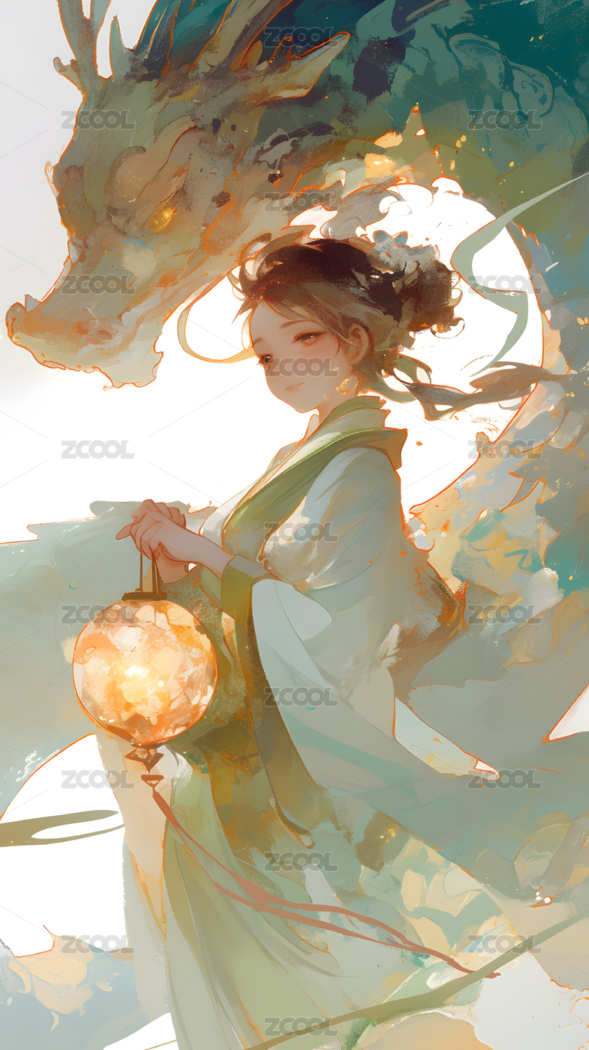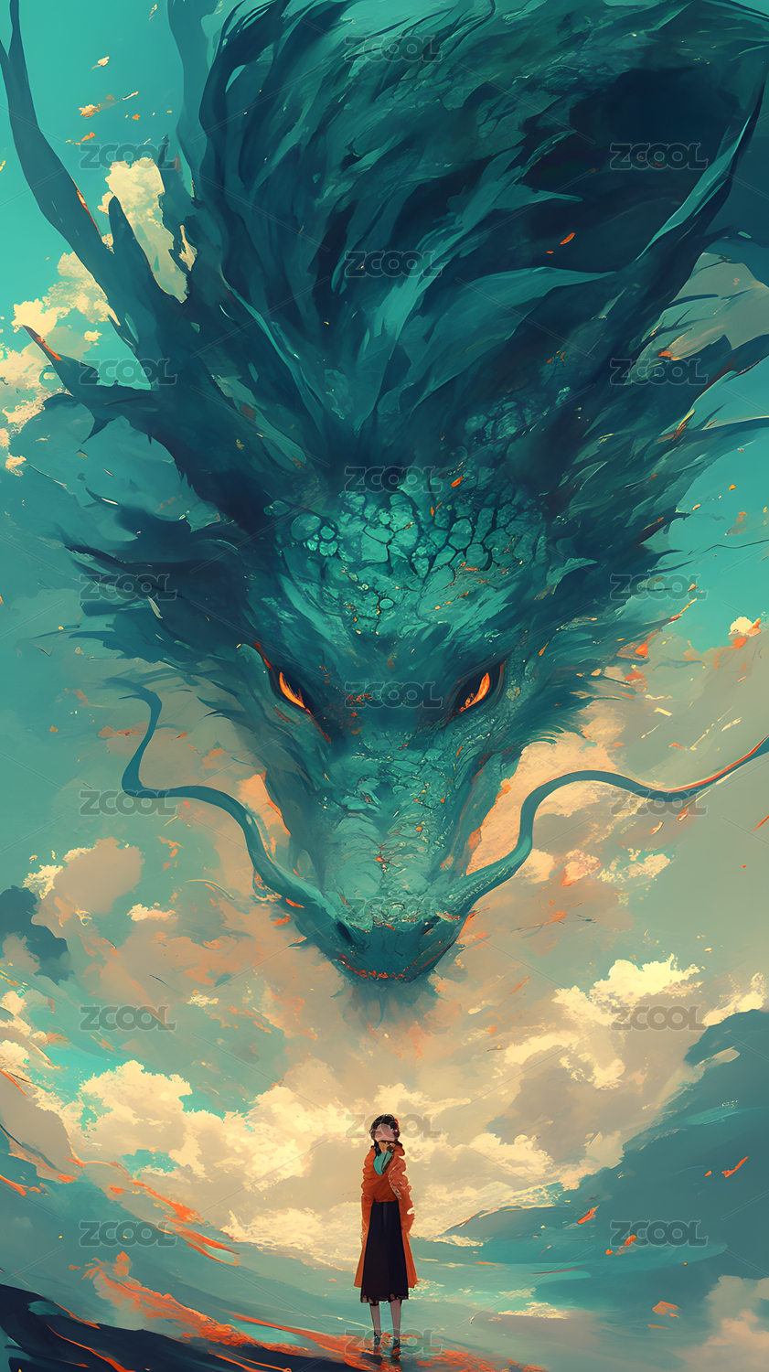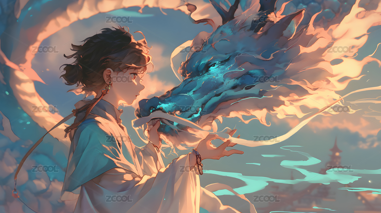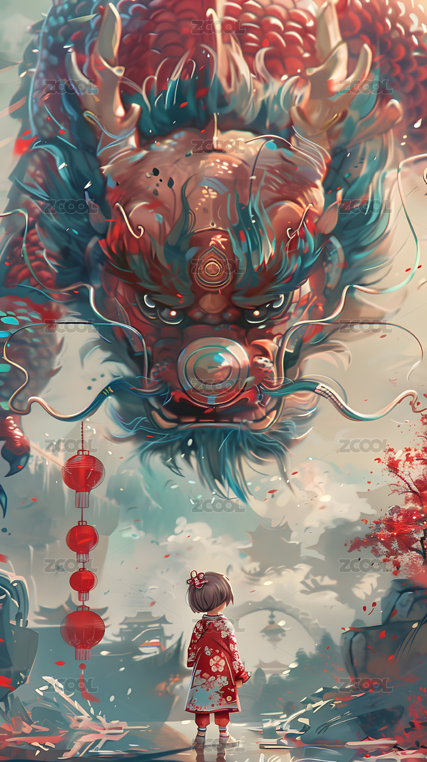 绘画,女孩,东方,神龙,红色,白色,祥和,冥想,守护,灵性