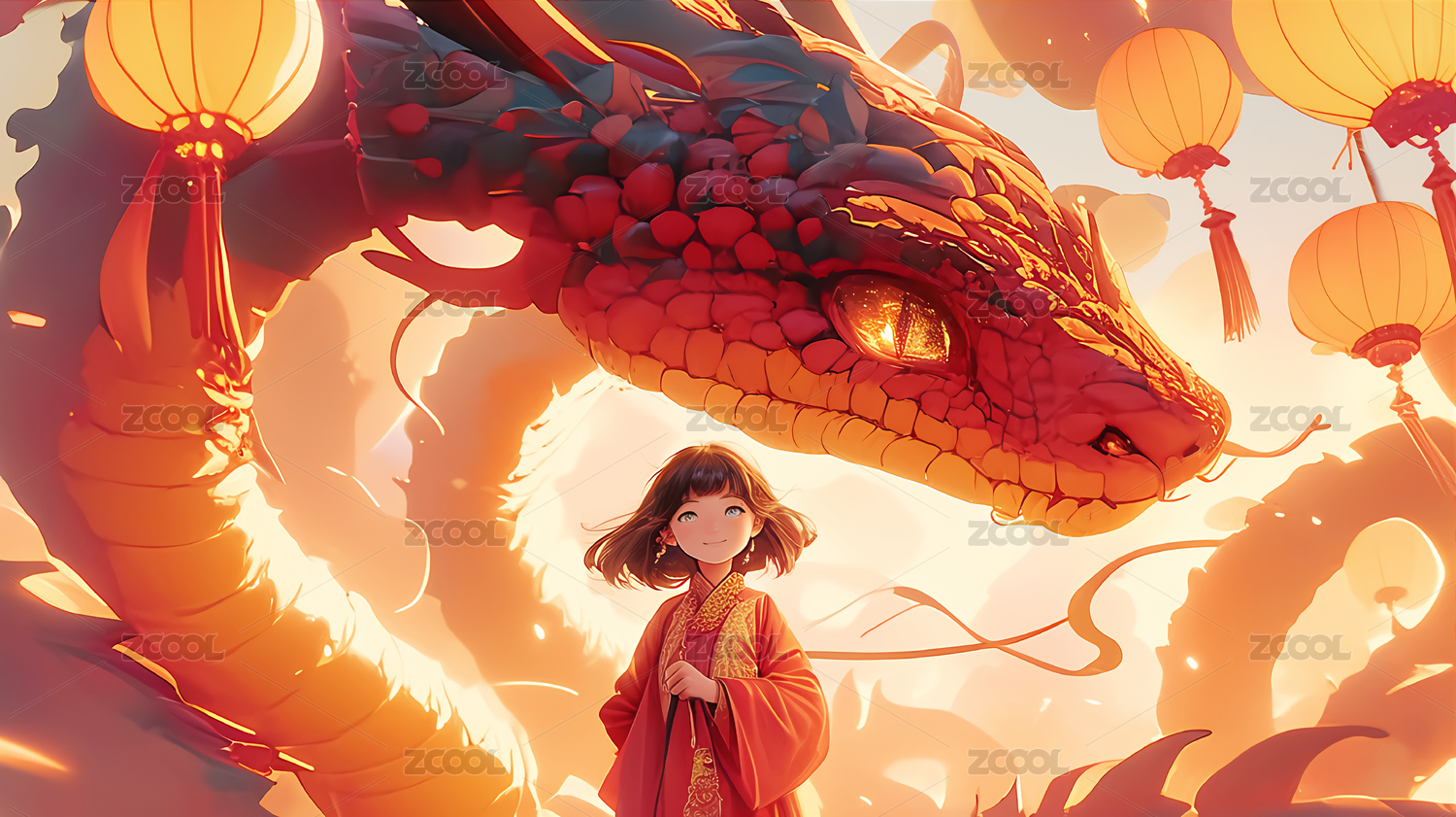 新年蛇年卡通3D汉服女孩和红色蛇插画
