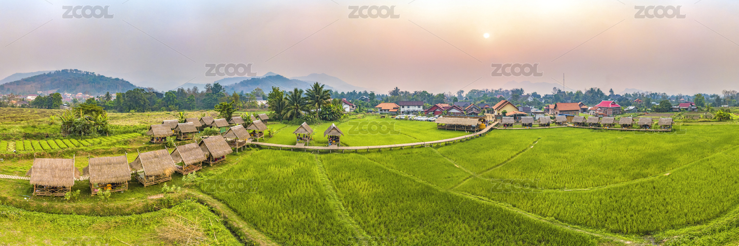 Golden Rice Paddy Field and Cottage Villas in Vang Vieng, Laos, Southeast Asia
